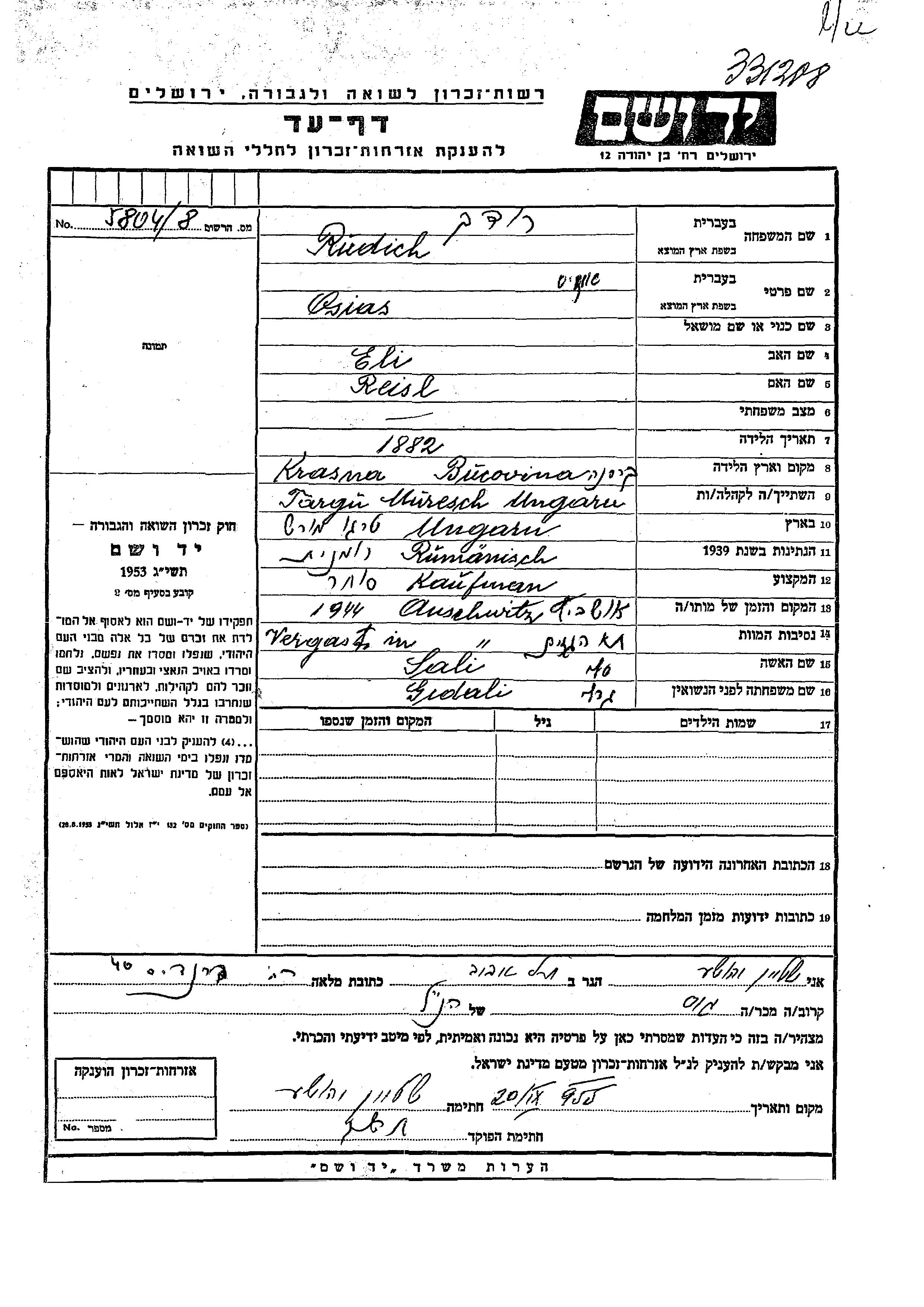 Osias Rudich Rodakh wurde im Jahr 1882 in Krasna, Rumänien geboren. Er war der Sohn von Eli und Reisl. Er war Kaufmann/-frau und mit Sali, geb. Gidali Gedali Verheiratet. Vor dem Zweiten Weltkrieg lebte er in Targu Mures, Rumänien. Während des Krieges war er in Targu Mures, Rumänien.