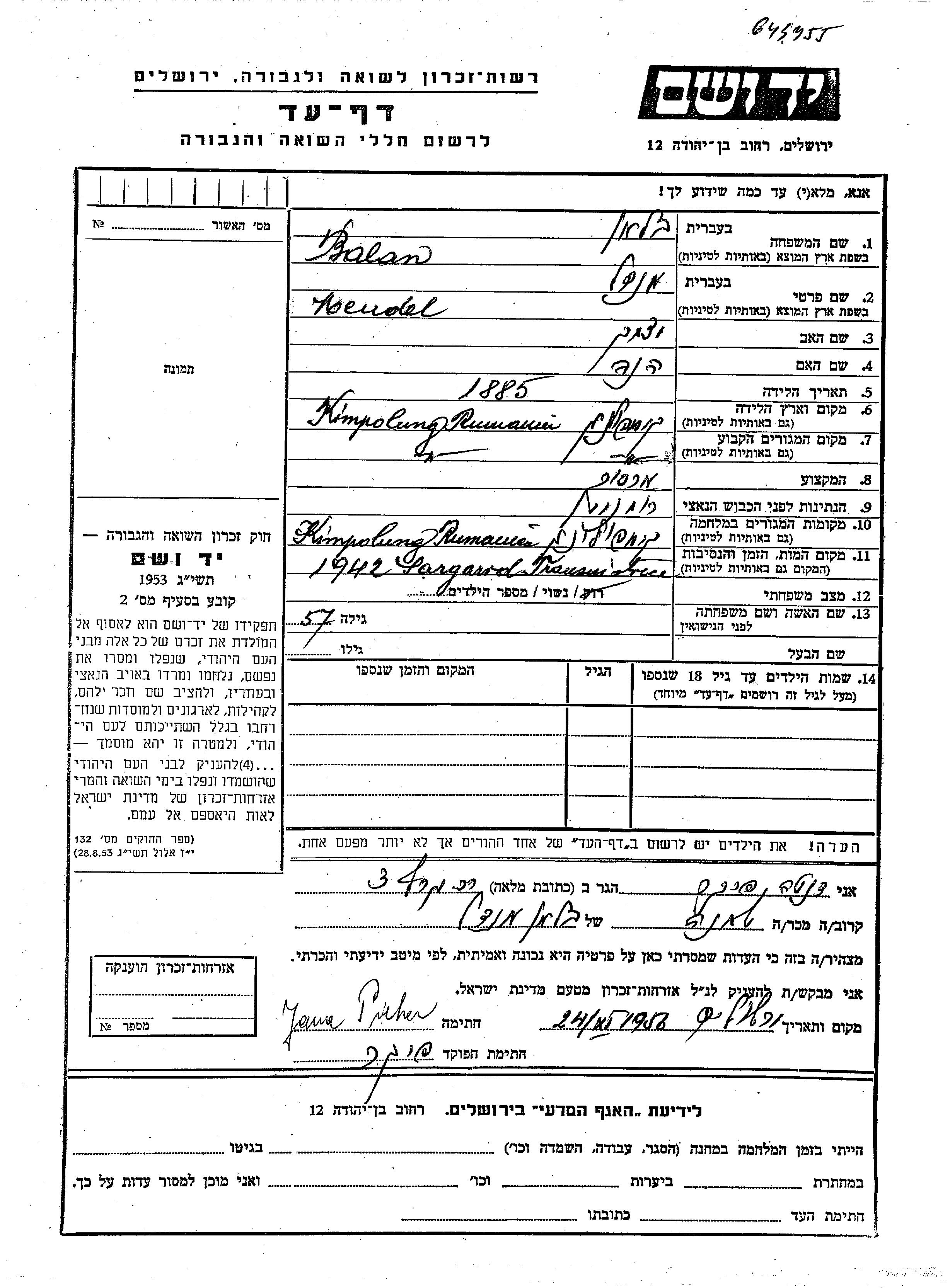 Mendel Balan Blan wurde im Jahr 1885 in Kimpolung, Rumänien geboren. Er war der Sohn von Yitzkhak und Hena. Er war Kaufmann/-frau und Verheiratet. Vor dem Zweiten Weltkrieg lebte er in Kimpolung, Rumänien. Während des Krieges war er in Kimpolung, Rumänien.