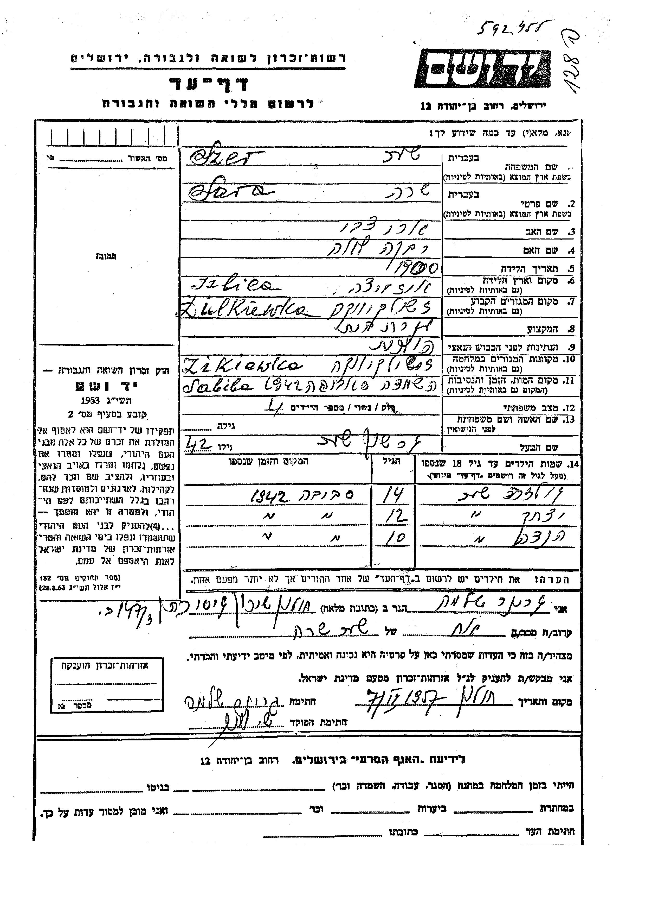 Sara Szer wurde im Jahr 1900 in Izbica, Polen geboren. Sie war die Tochter von Tzvi Arie und Lea Rivka. Sie war Hausfrau und mit Gershon Verheiratet. Vor dem Zweiten Weltkrieg lebte sie in Zulkiewka, Polen. Während des Krieges war sie in Zulkiewka, Polen.