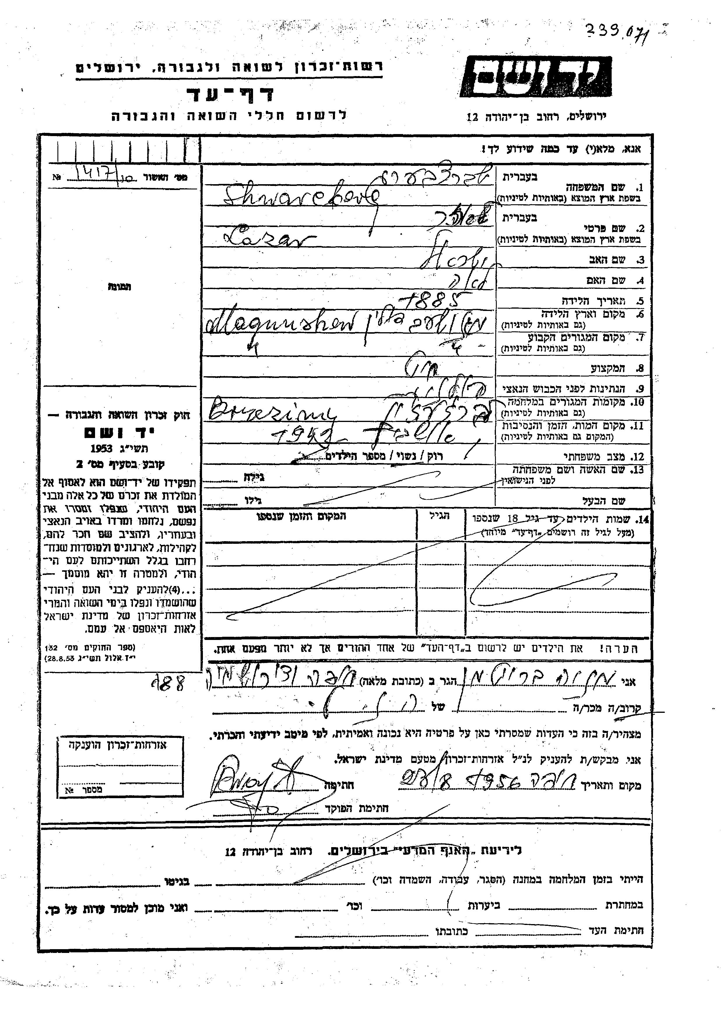 Lazar Shwarcberg wurde im Jahr 1885 in Magnuszew, Polen geboren. Er war der Sohn von Yisrael und Lea. Er war Schneider und Verheiratet. Vor dem Zweiten Weltkrieg lebte er in Magnuszew, Polen. Während des Krieges war er in Brzeziny, Polen.