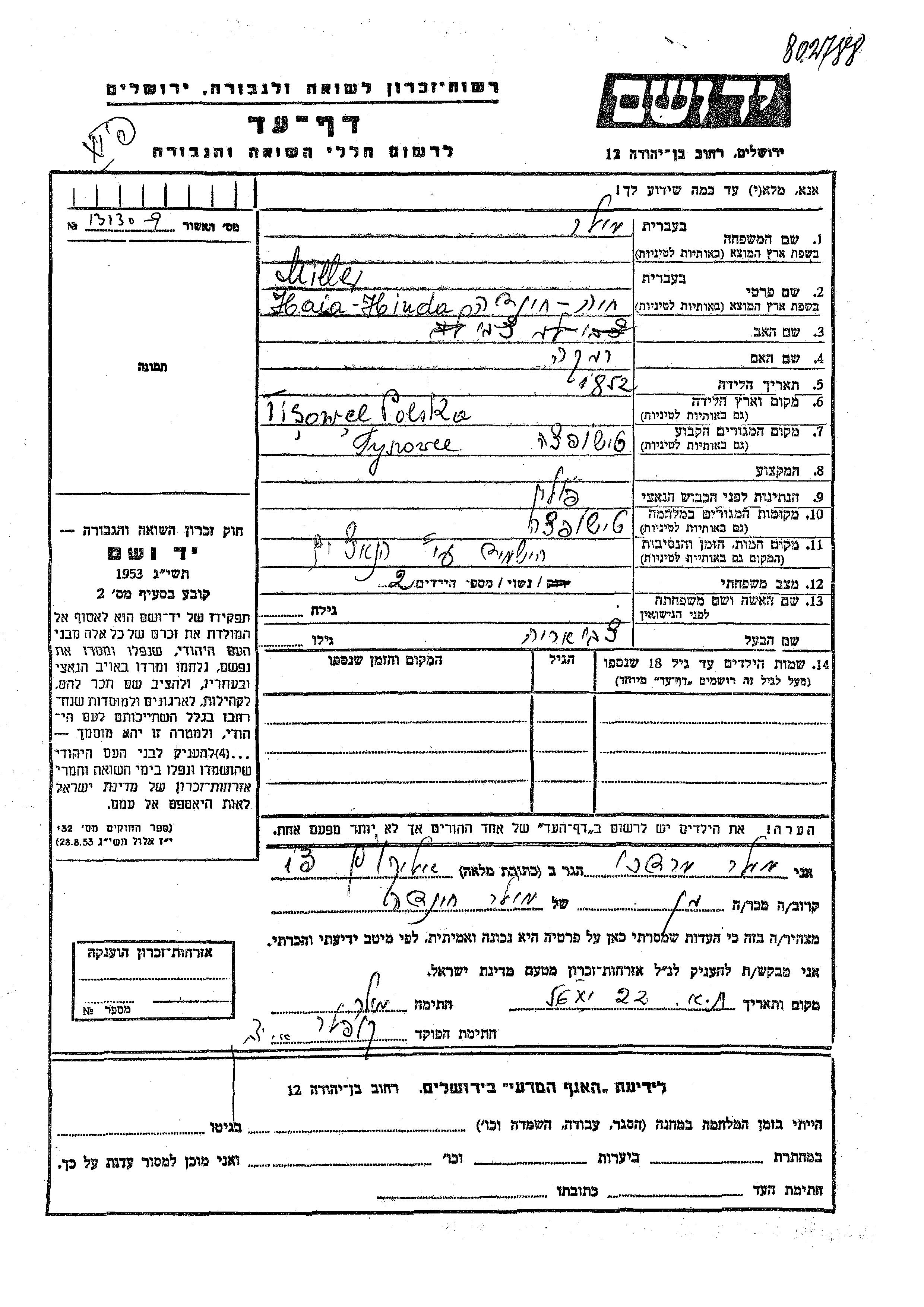 Haia Hinda Miller wurde im Jahr 1852 in Tyszowce, Polen geboren. Sie war die Tochter von Tzvi Lev und Rivka. Sie war mit Tzvi Arie Verheiratet. Vor dem Zweiten Weltkrieg lebte sie in Tyszowce, Polen. Während des Krieges war sie in Tyszowce, Polen.