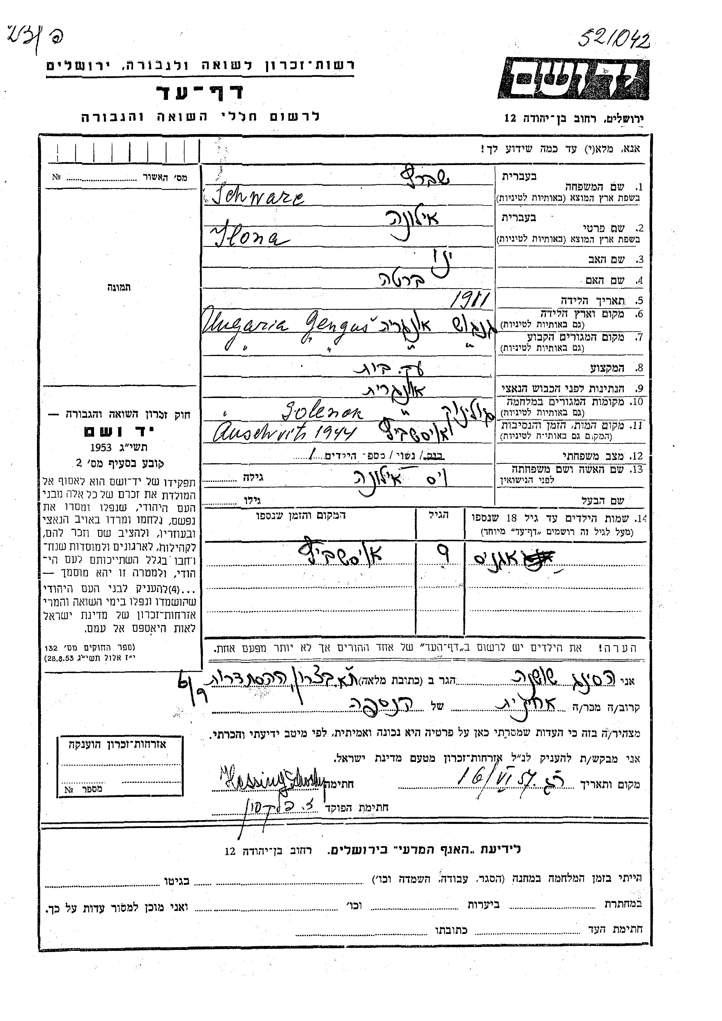 Ilona Schwarc, geb. Veis wurde im Jahr 1911 in Gyongyos, Ungarn geboren. Sie war die Tochter von Yeno und Berta. Sie war Hausfrau und Verheiratet. Vor dem Zweiten Weltkrieg lebte sie in Gyongyos, Ungarn. Während des Krieges war sie in Szolnok, Ungarn.