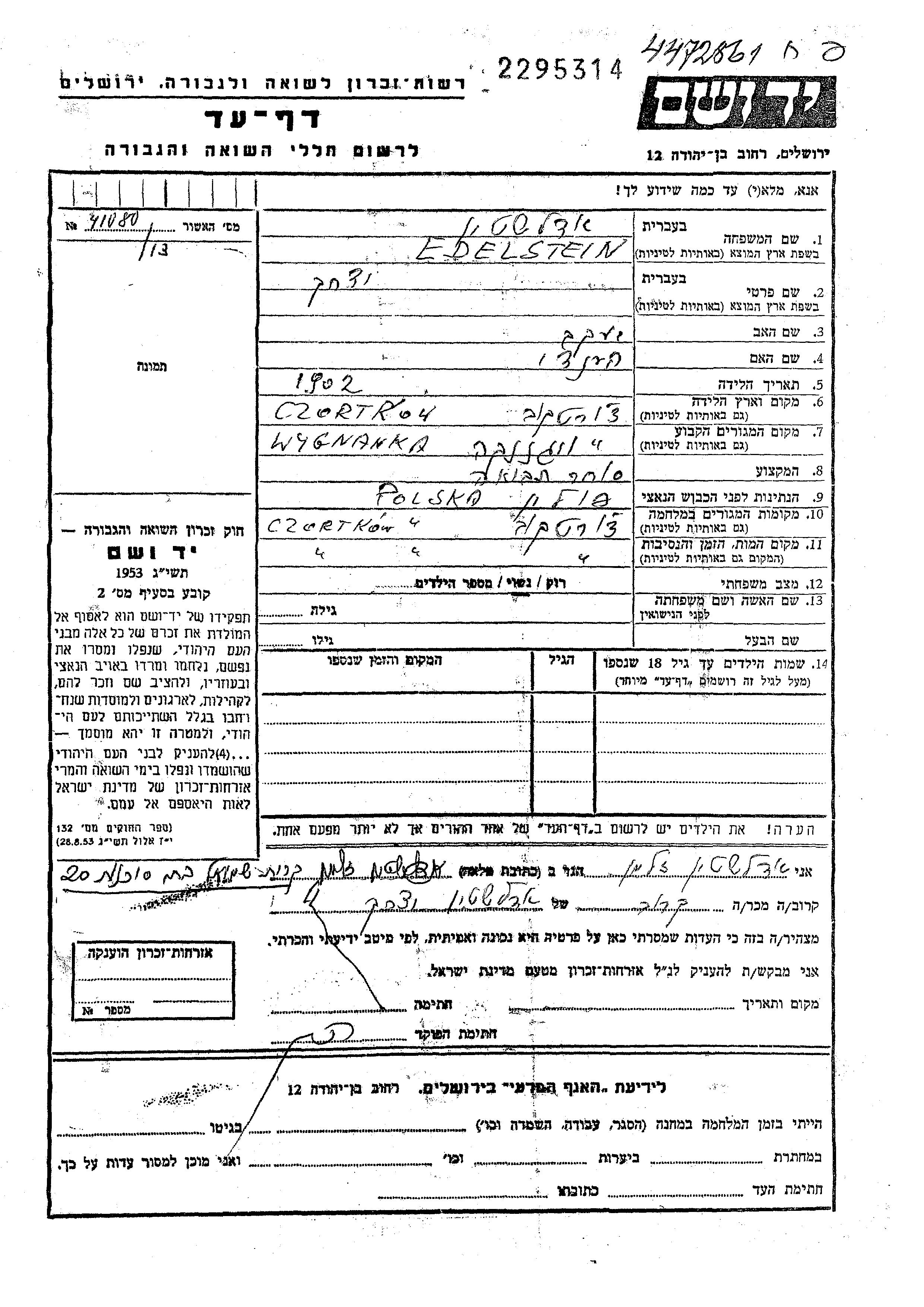 Yitzkhak Edelstein wurde im Jahr 1902 in Czortkow, Polen geboren. Er war der Sohn von Yaakov und Khana. Er war Getreidehändler/-in und Verheiratet. Vor dem Zweiten Weltkrieg lebte er in Wygnanka, Polen. Während des Krieges war er in Czortkow, Polen.