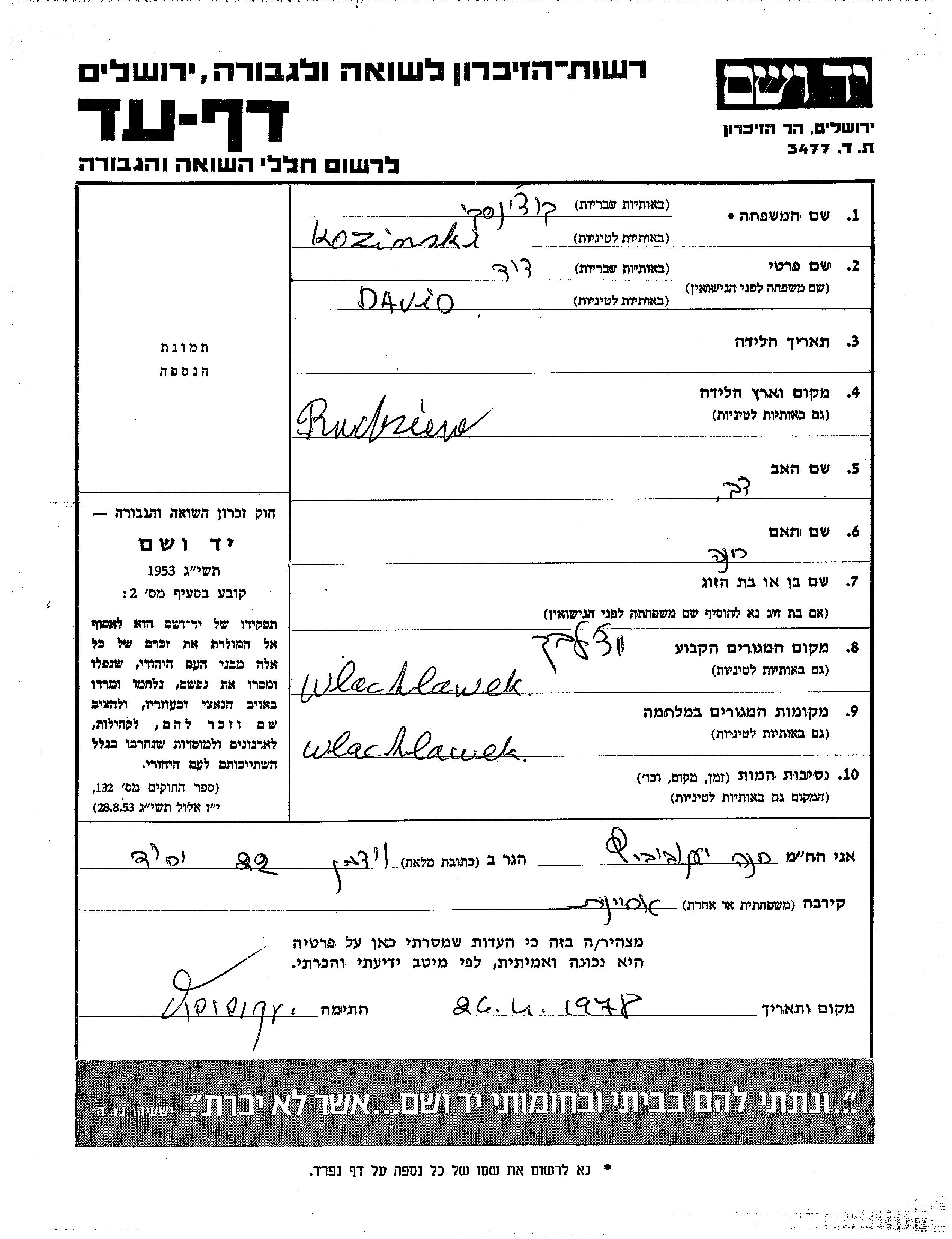 Kozinski Kuchinski David Wloclawek, Polen Gedenkblatt
