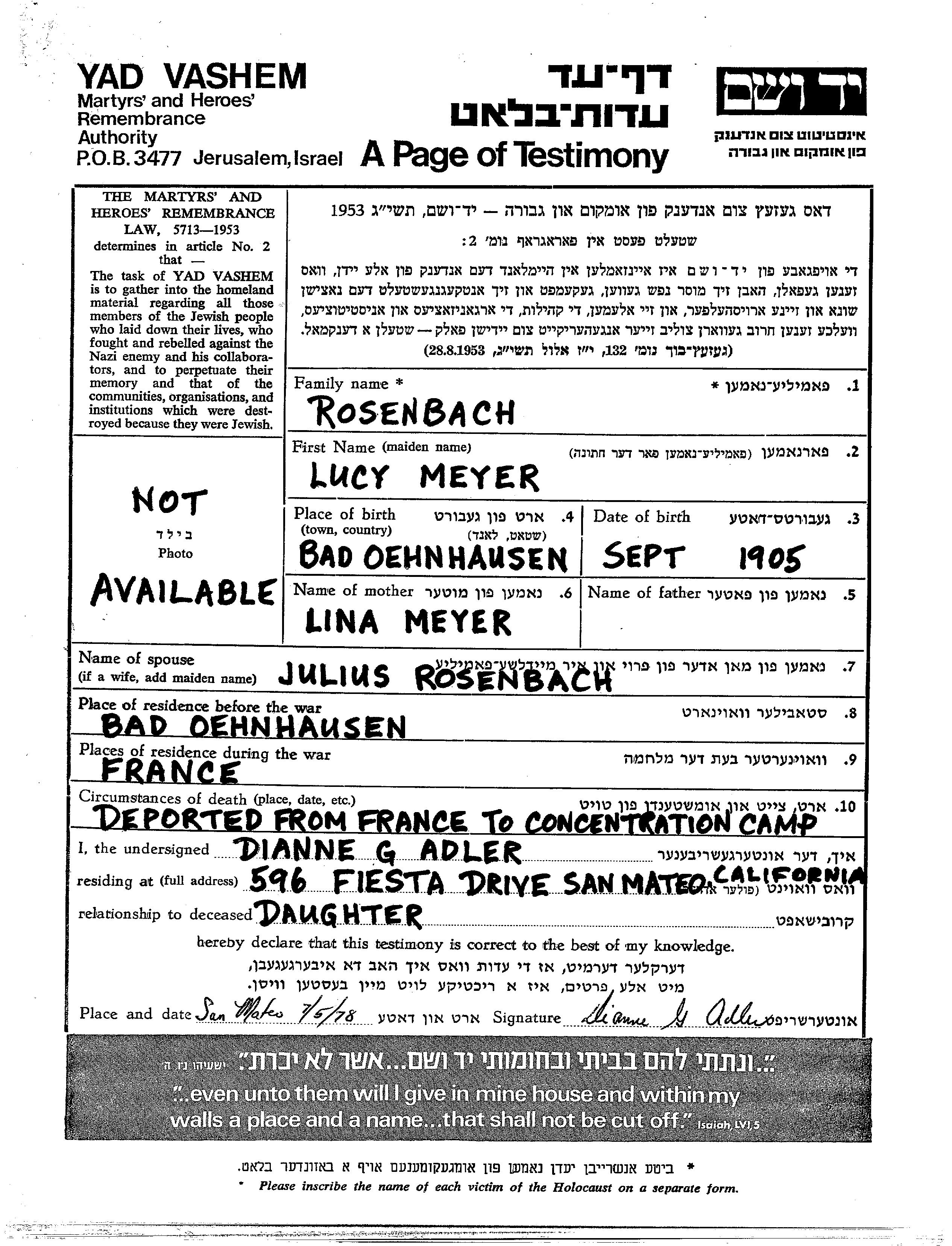 Lucy Rosenbach, geb. Meyer wurde im Jahr 1905 in Bad Oeynhausen, Deutsches Reich geboren. Sie war die Tochter von Lina. Sie war mit Julius Verheiratet. Vor dem Zweiten Weltkrieg lebte sie in Bad Oeynhausen, Deutsches Reich. Während des Krieges war sie in Frankreich.