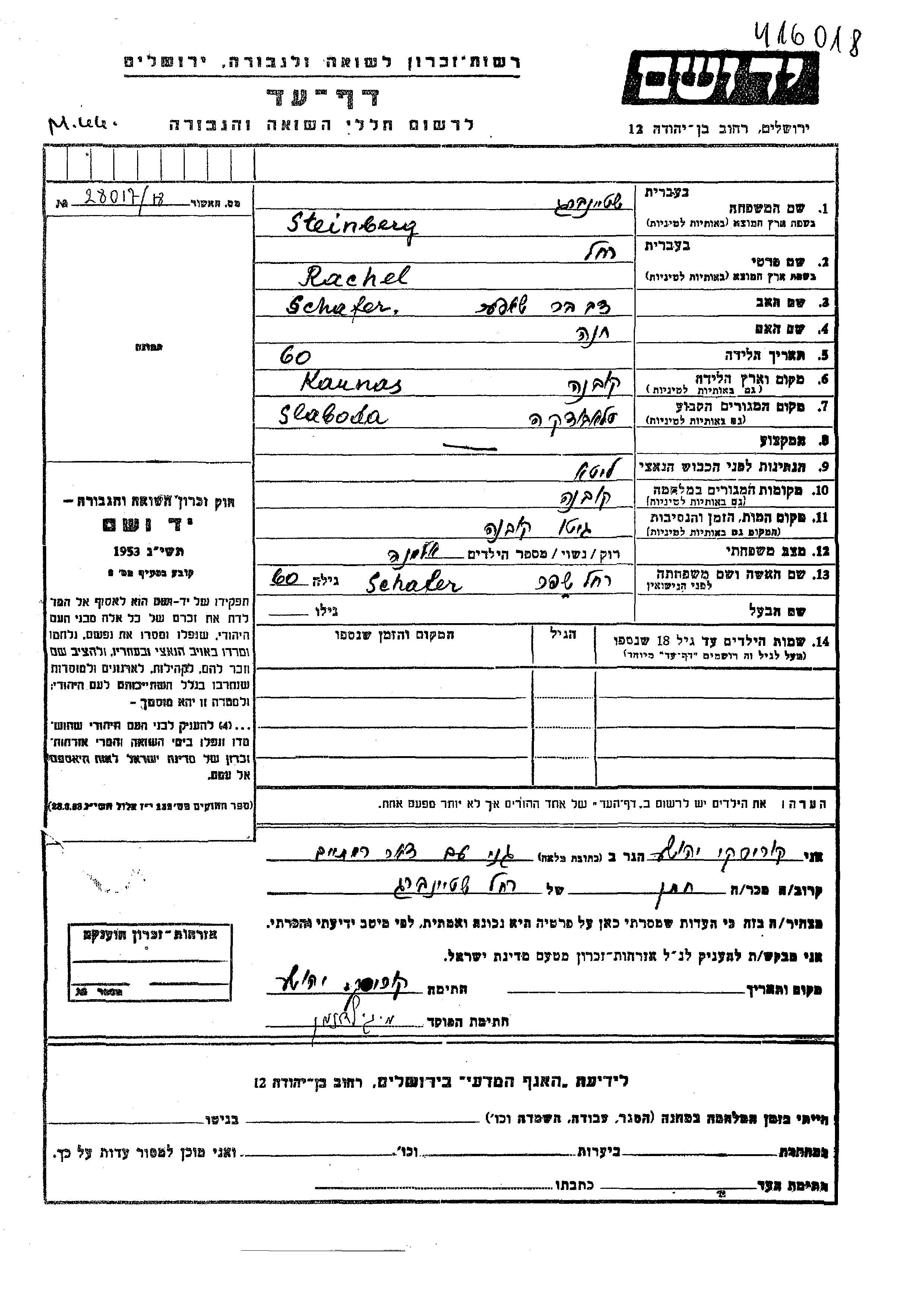 Rachel Steinberg, geb. Shefer wurde in Kaunas, Litauen geboren. Sie war die Tochter von Dov Ber und Khana. Sie war mit Rakhel Witwe. Vor dem Zweiten Weltkrieg lebte sie in Slobodka, Litauen. Während des Krieges war sie in Kowno, Litauen.