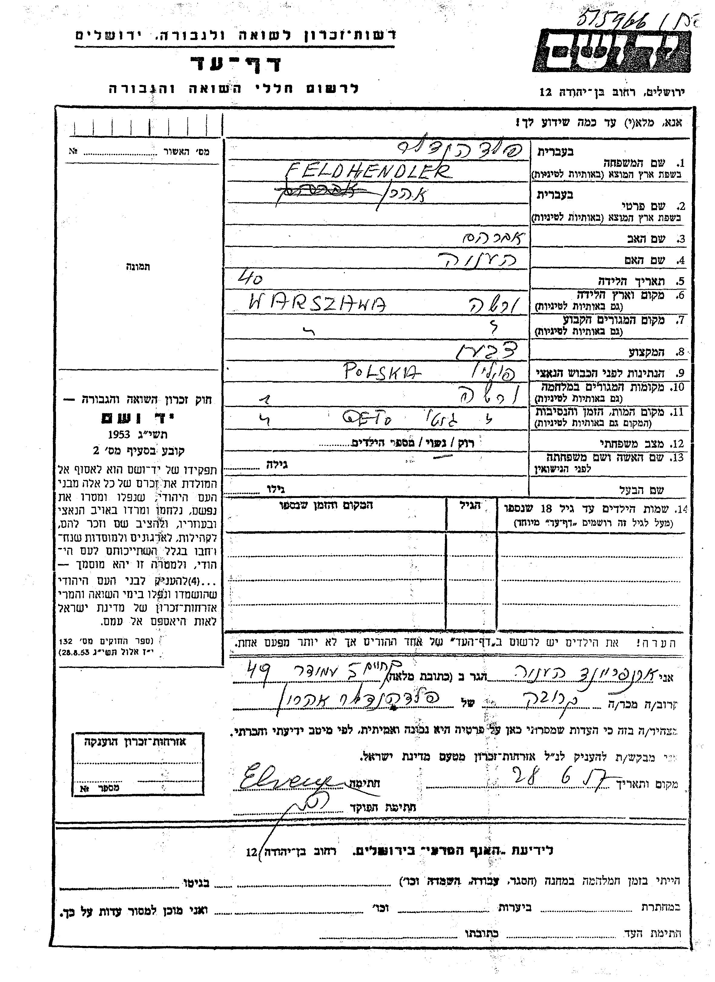 Feldhendler Aharon Warszawa, Polen Gedenkblatt