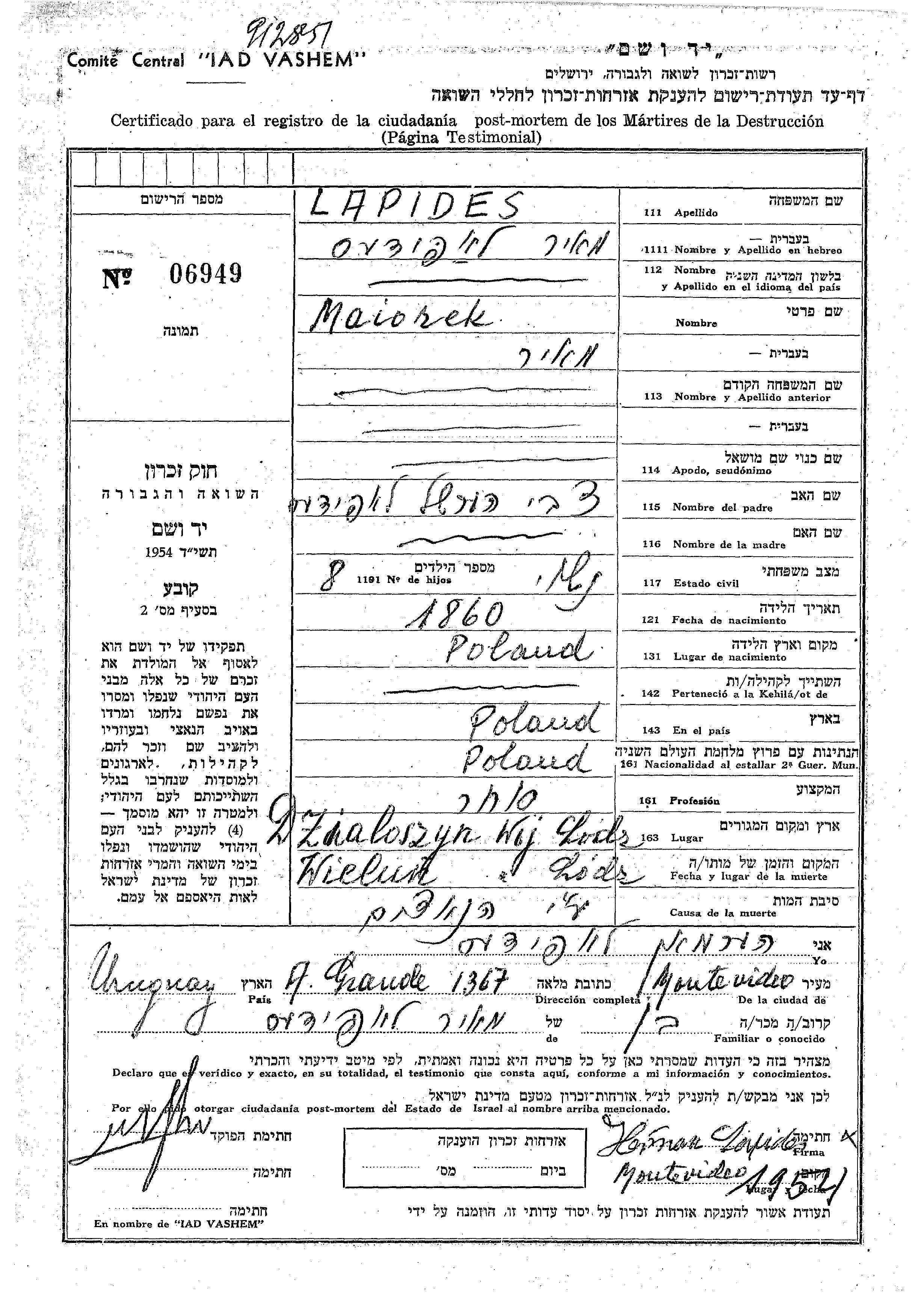 Maiorek Lapides wurde im Jahr 1860 in Polen geboren. Er war der Sohn von Tzvi Hershl. Er war Kaufmann/-frau und Verheiratet. Vor dem Zweiten Weltkrieg lebte er in Polen. Während des Krieges war er in Dzialoszyn, Polen.