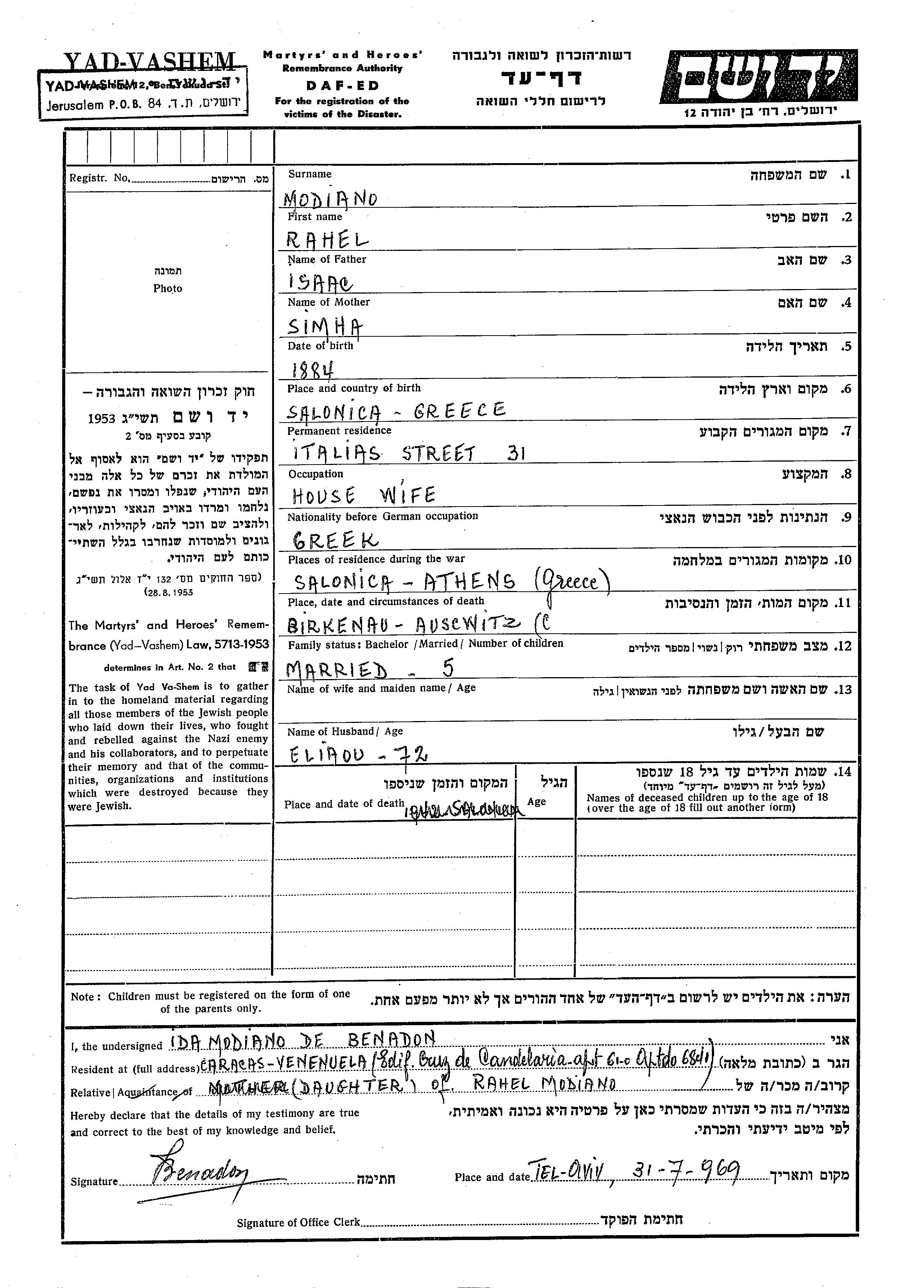Rahel Modiano wurde im Jahr 1884 in Salonique, Griechenland geboren. Sie war die Tochter von Isaac und Simha. Sie war Hausfrau und mit Eliaoy Verheiratet. Vor dem Zweiten Weltkrieg lebte sie in Salonique, Griechenland. Während des Krieges war sie in Salonique, Griechenland.