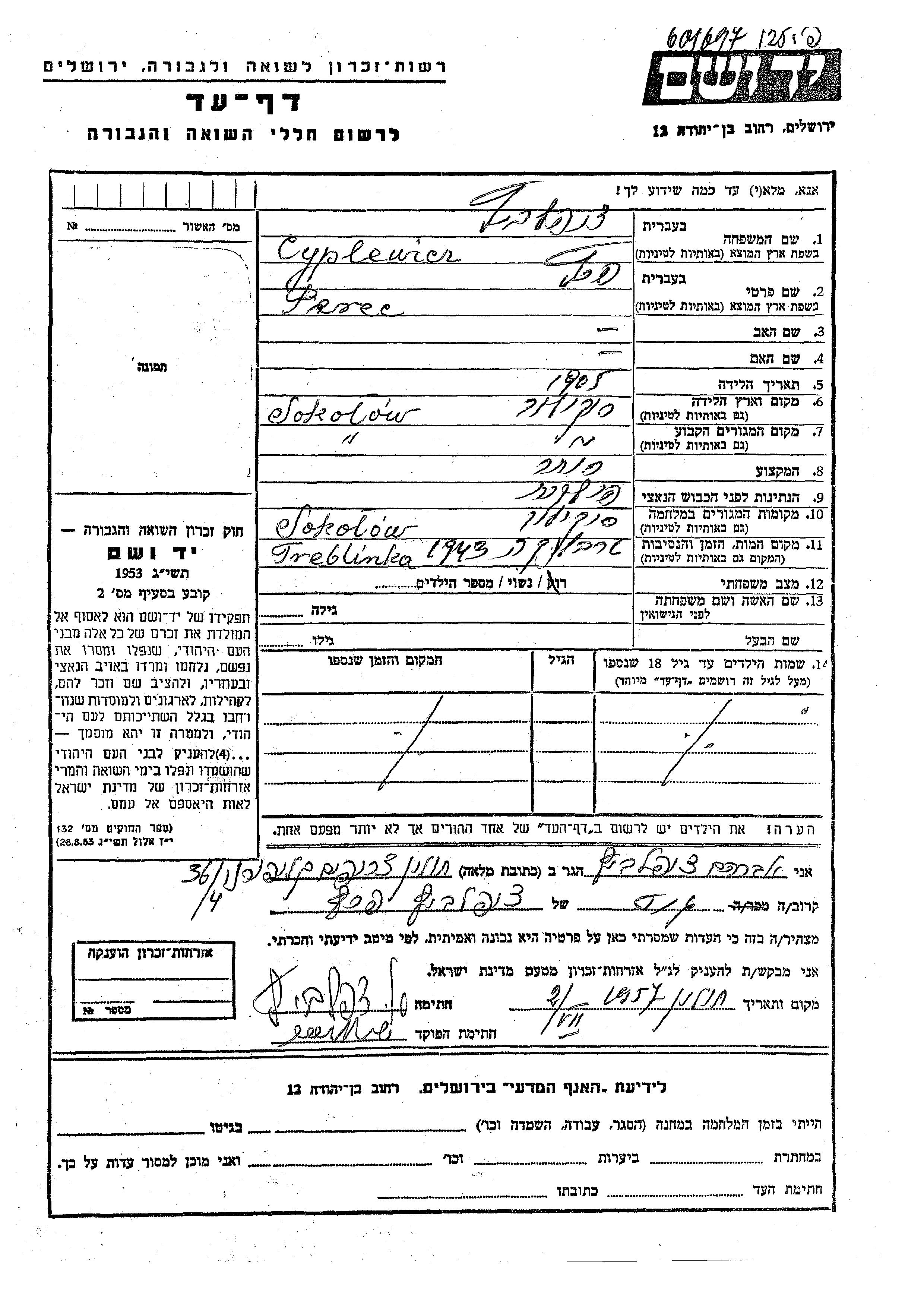 Perec Cyplewics wurde im Jahr 1905 in Sokolow Podlaski, Polen geboren. Er war Kaufmann/-frau und Verheiratet. Vor dem Zweiten Weltkrieg lebte er in Sokolow Podlaski, Polen. Während des Krieges war er in Sokolow Podlaski, Polen.