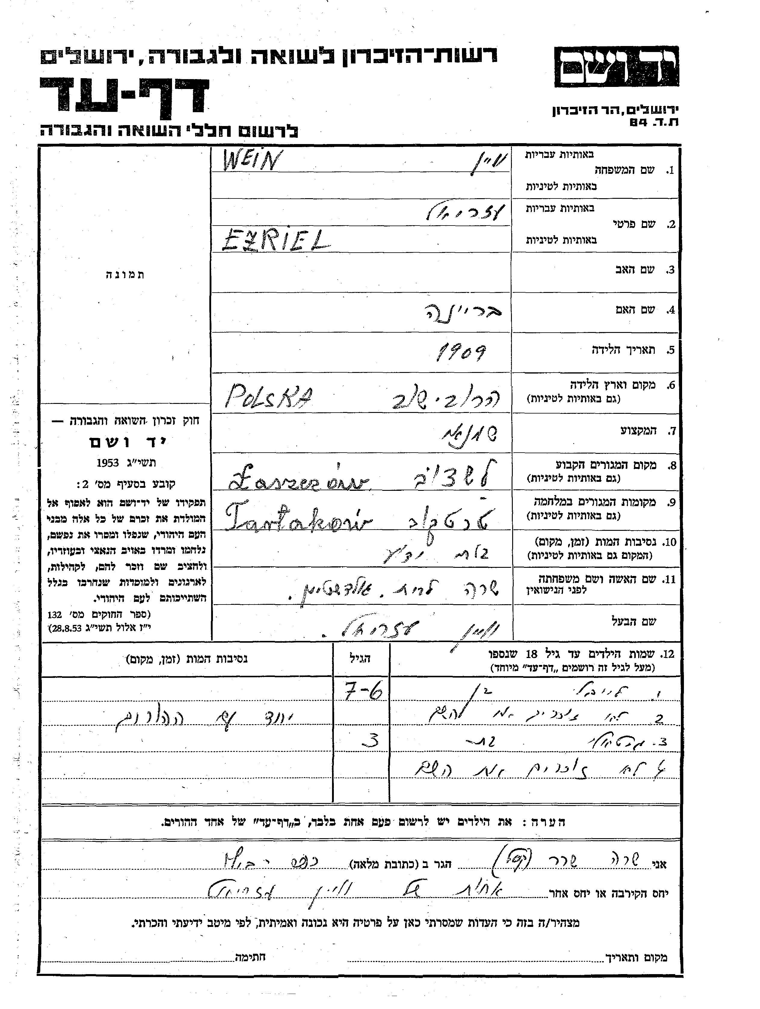 Ezriel Wein wurde im Jahr 1909 in Hrubieszow, Polen geboren. Er war der Sohn von Breina. Er war Assessor. Vor dem Zweiten Weltkrieg lebte er in Laszczow, Polen. Während des Krieges war er in Tartakow, Polen.