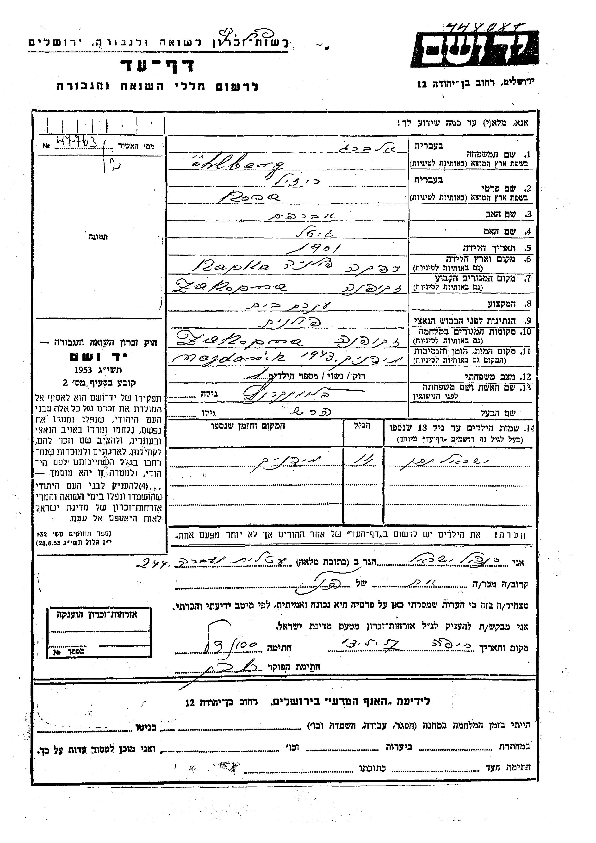 Rosa Oehlberg, geb. Blumenkrantz wurde im Jahr 1901 in Rabka, Polen geboren. Sie war die Tochter von Avraham und Gitel. Sie war Hausfrau und mit Hersh Verheiratet. Vor dem Zweiten Weltkrieg lebte sie in Zakopane, Polen. Während des Krieges war sie in Zakopane, Polen.