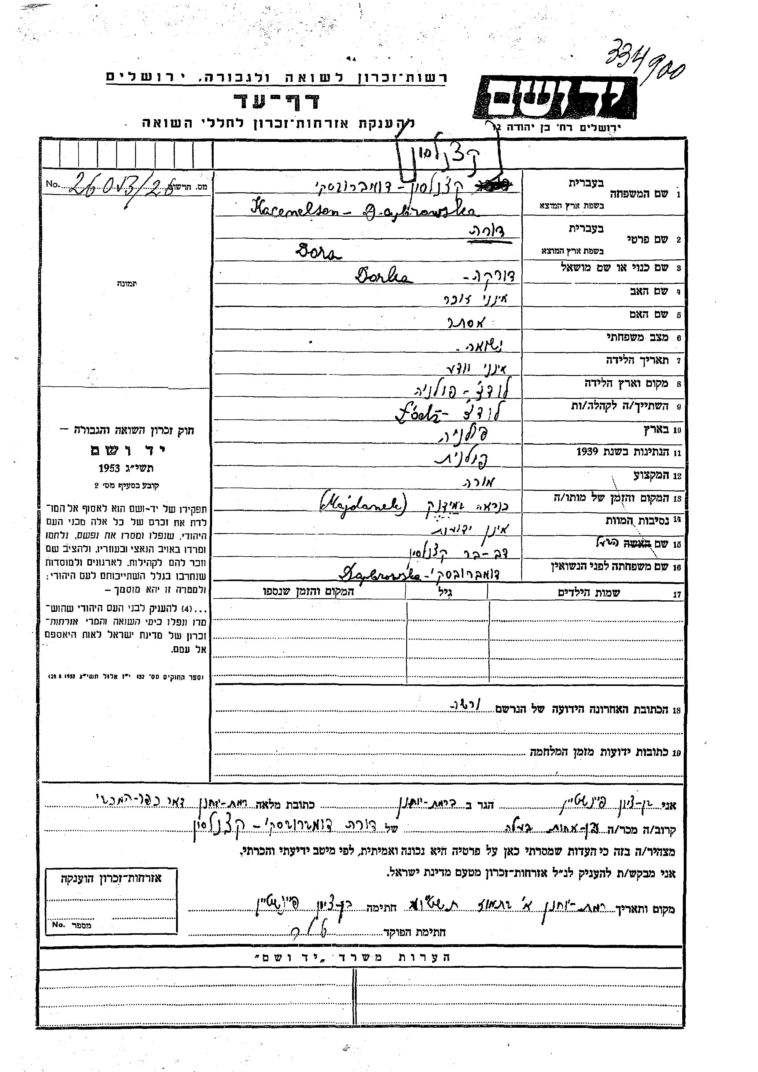 Dorka Kacenelson Dabrowska, geb. Dabrowska wurde in Lodz, Polen geboren. Sie war die Tochter von Ester. Sie war Lehrer/in und mit Dov Ber Verheiratet. Während des Krieges war sie in Warszawa, Polen.