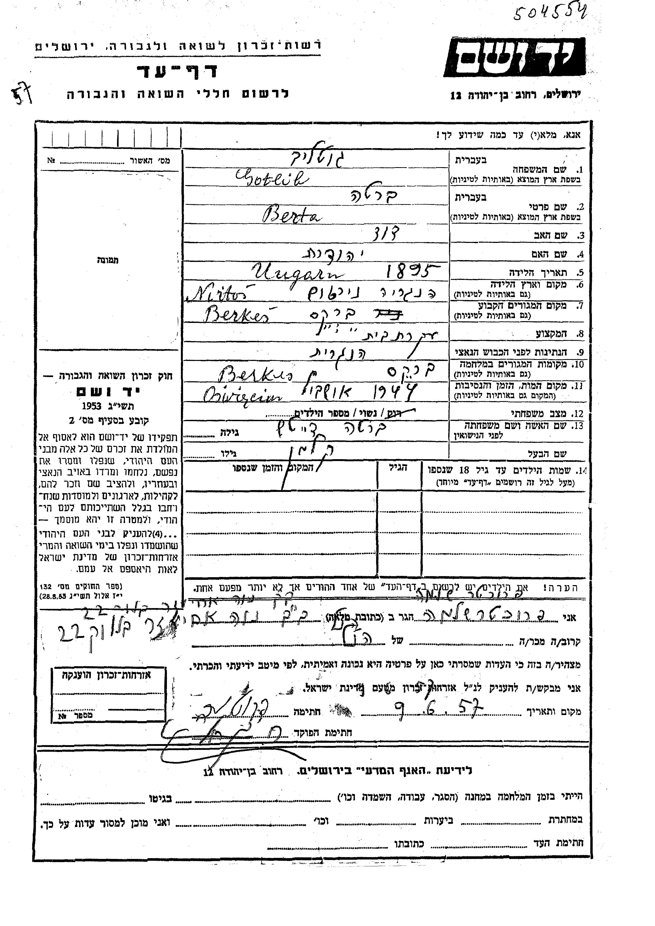 Berta Gotlib, geb. Deich wurde im Jahr 1895 geboren. Sie war die Tochter von David und Yehudit. Sie war Hausfrau und mit Kalman Verheiratet. Vor dem Zweiten Weltkrieg lebte sie in Berkesz, Ungarn. Während des Krieges war sie in Berkesz, Ungarn.