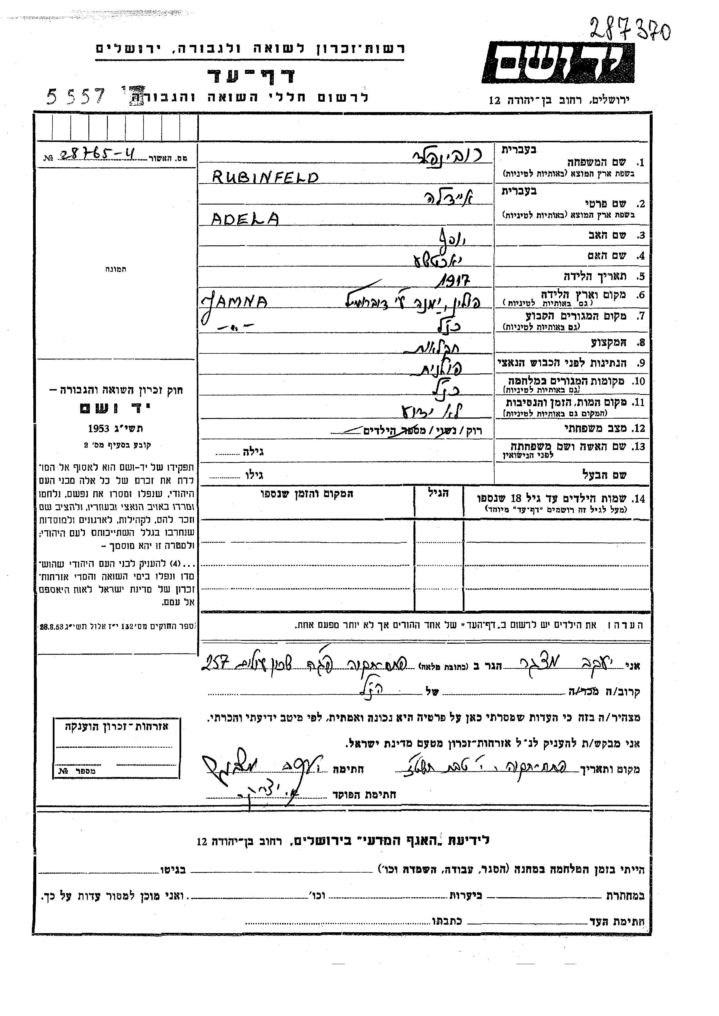 Rubinfeld Adela 1917 Jamna, Polen Gedenkblatt