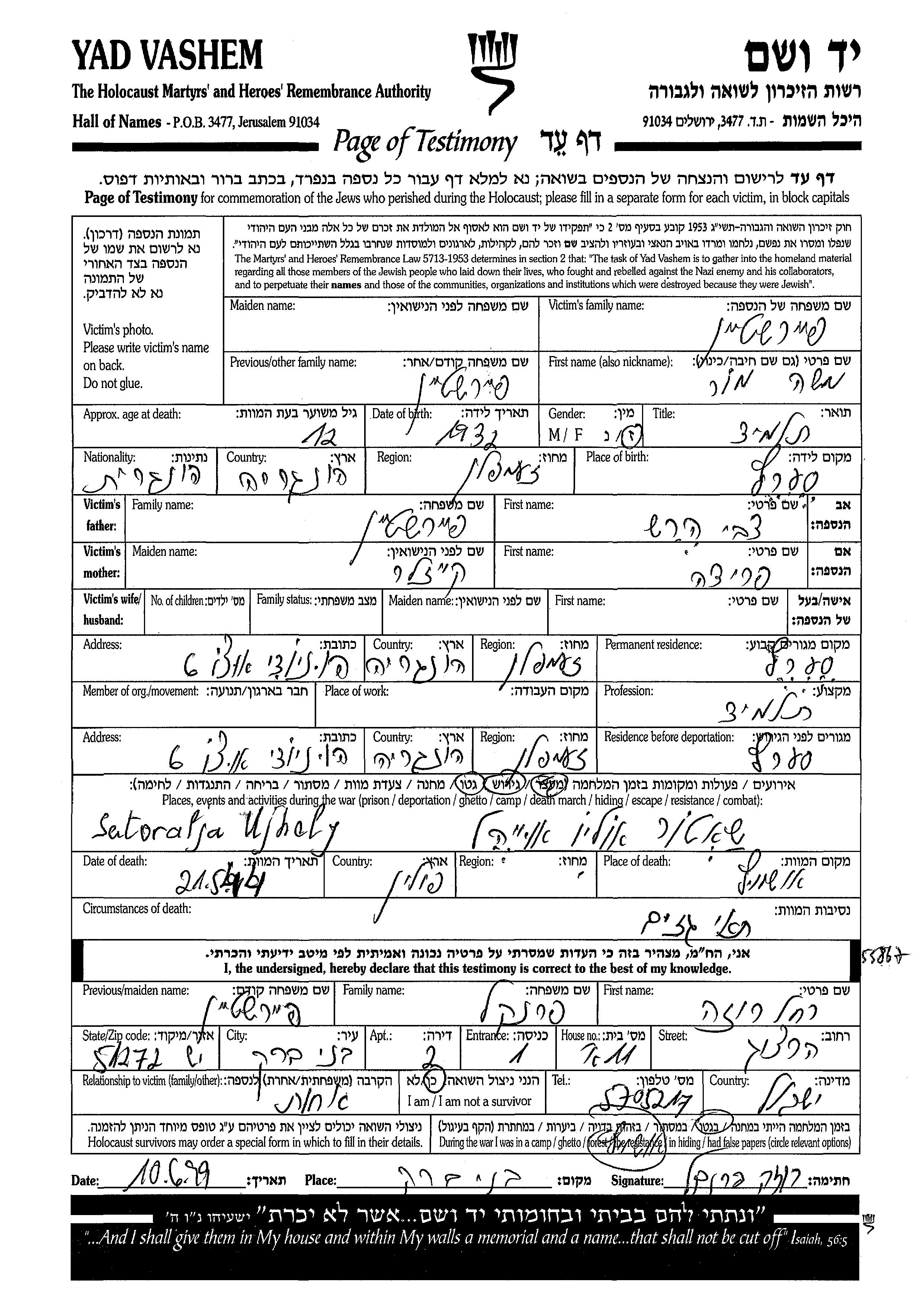 Mor Moshe Foiershtein wurde im Jahr 1932 in Seret, Rumänien geboren. Er war der Sohn von Tzvi Hersh und Frida. Er war Schüler/-in. Vor dem Zweiten Weltkrieg lebte er in Seret, Rumänien. Während des Krieges war er in Satoraljaujhely, Ungarn.