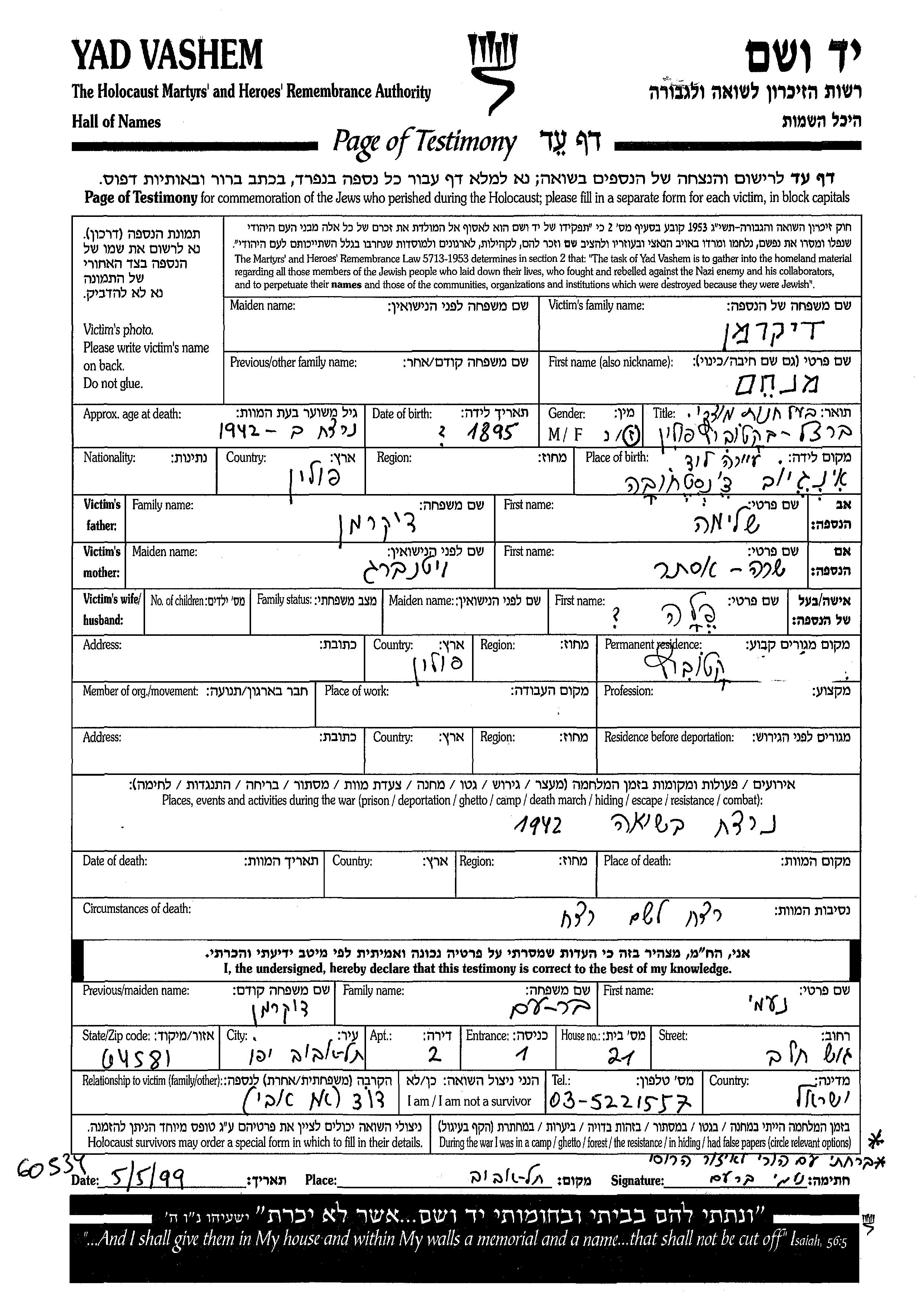 Menakhem Dikerman wurde im Jahr 1895 geboren. Er war der Sohn von Shlima und Sara Ester. Er war Besitzer eines eisenhandels. Vor dem Zweiten Weltkrieg lebte er in Katowice, Polen.