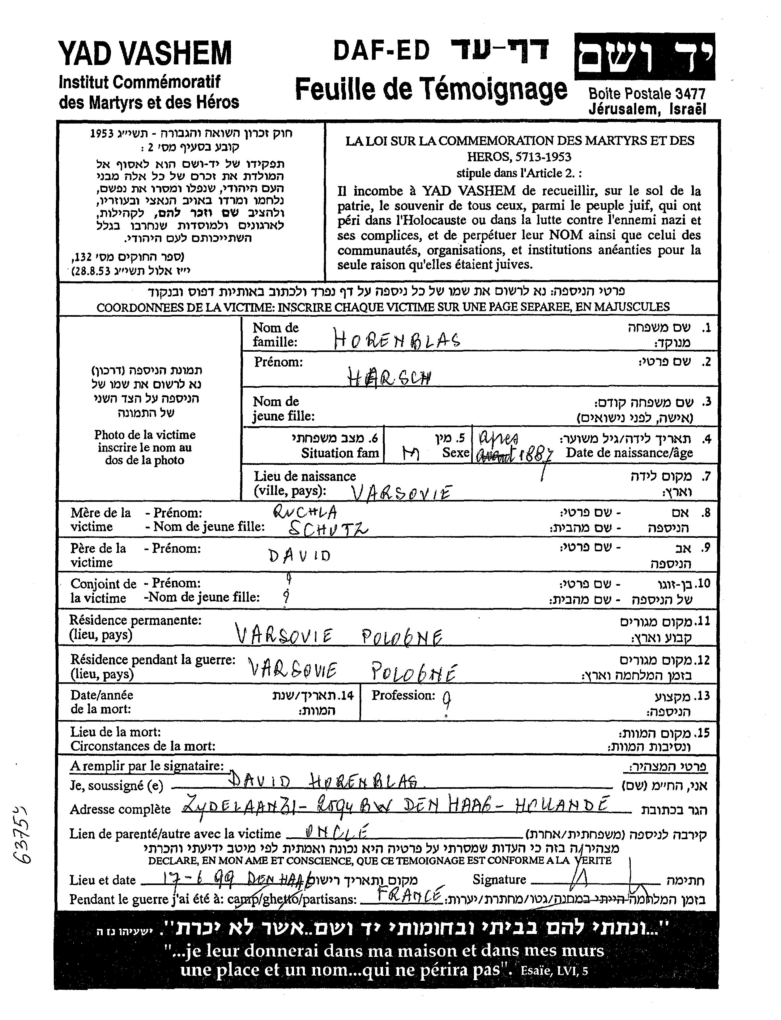 Harsch Horenblas wurde im Jahr 1887 in Varsovie, Polen geboren. Er war der Sohn von David und Ruchla. Vor dem Zweiten Weltkrieg lebte er in Varsovie, Polen. Während des Krieges war er in Varsovie, Polen.
