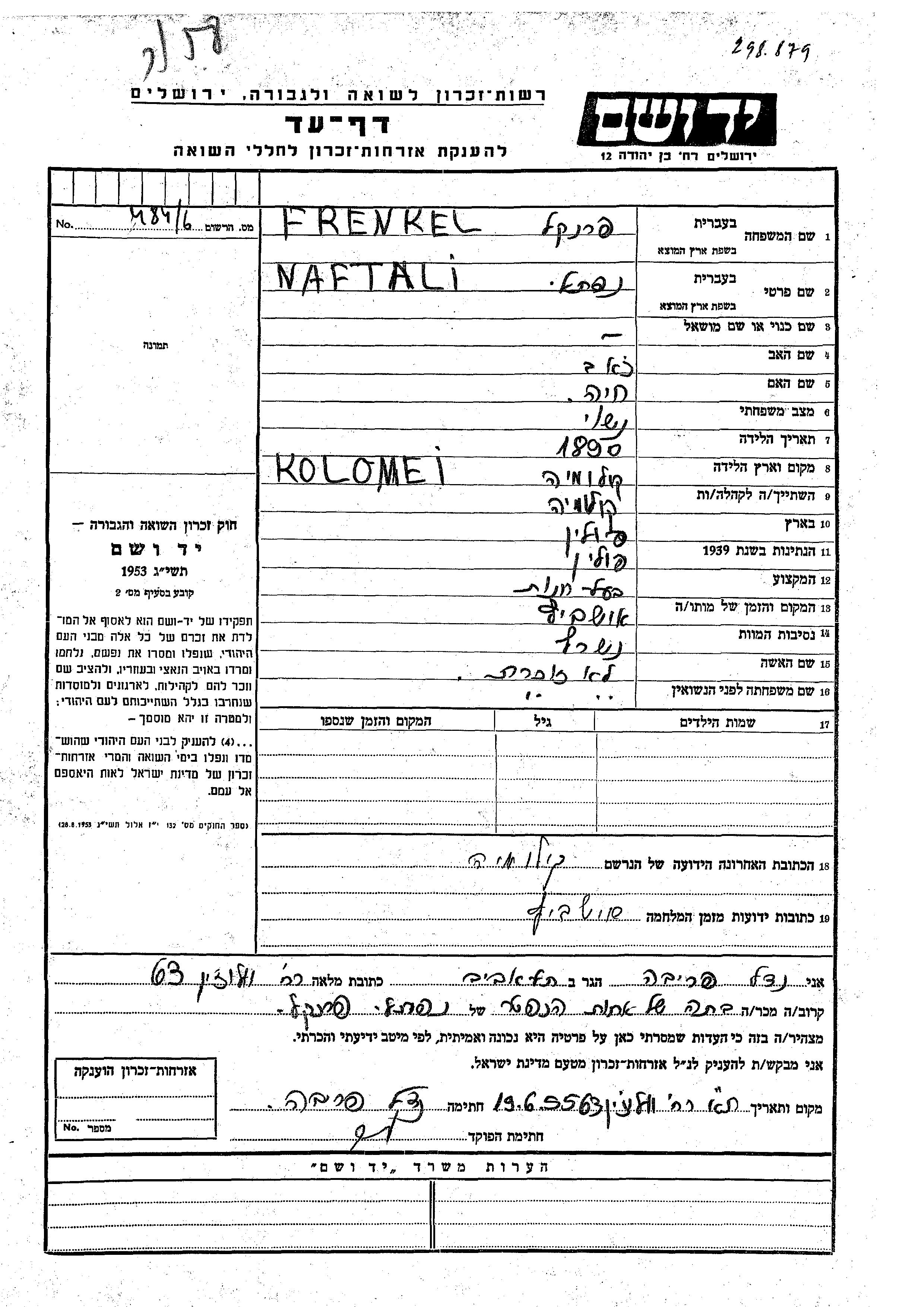 Naftali Frenkel wurde im Jahr 1890 in Kolomyja, Polen geboren. Er war der Sohn von Zeev und Khaia. Er war Ladenbesitzer/-in und Verheiratet. Vor dem Zweiten Weltkrieg lebte er in Kolomyja, Polen. Während des Krieges war er in Auschwitz, Polen.