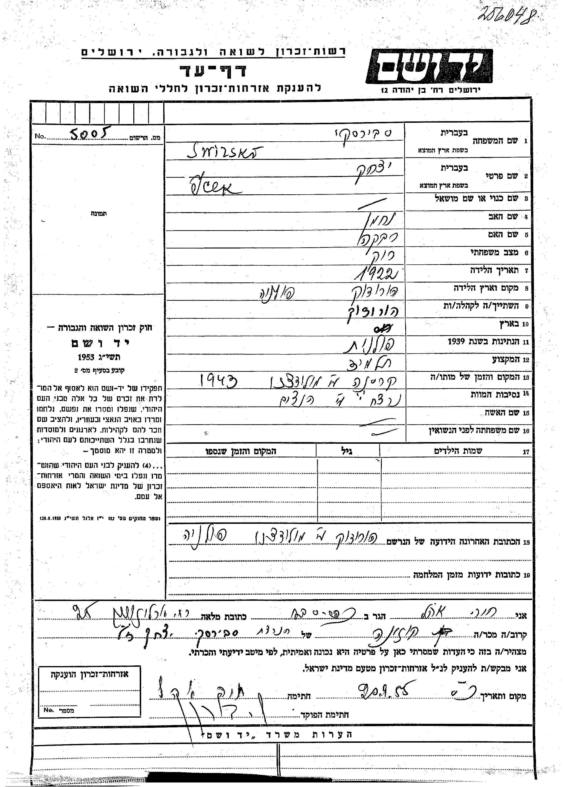 Icek Swirski wurde im Jahr 1922 in Horodok, Polen geboren. Er war der Sohn von Nakhman und Rivka. Er war Schüler/-in und Ledig. Vor dem Zweiten Weltkrieg lebte er in Horodok, Polen.