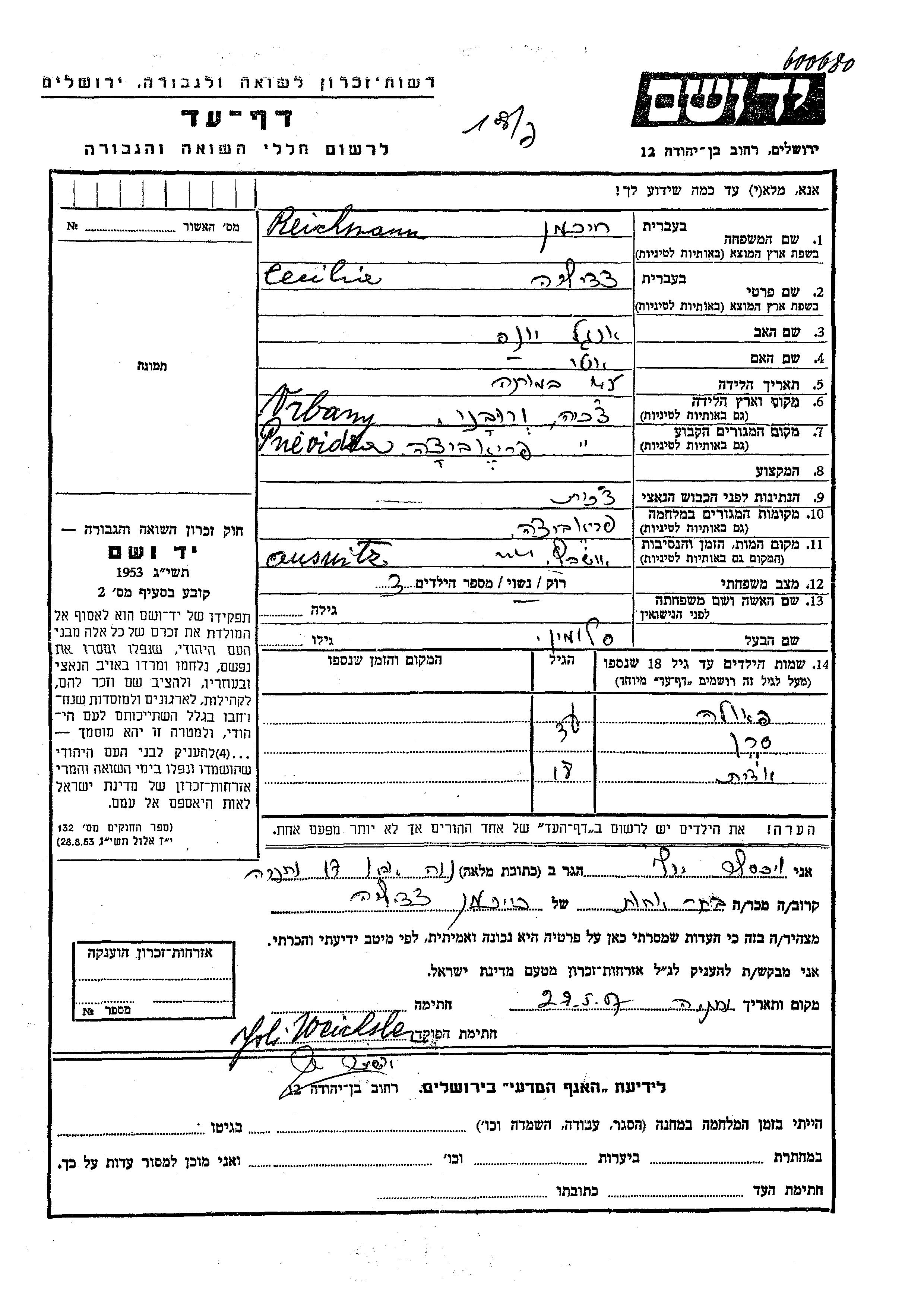 Cecilia Reichman wurde in Vrbany, Tschechoslowakei geboren. Sie war die Tochter von Engel Ionas und Ester. Sie war mit Salomon Verheiratet. Vor dem Zweiten Weltkrieg lebte sie in Prievidza, Tschechoslowakei. Während des Krieges war sie in Prievidza, Tschechoslowakei.