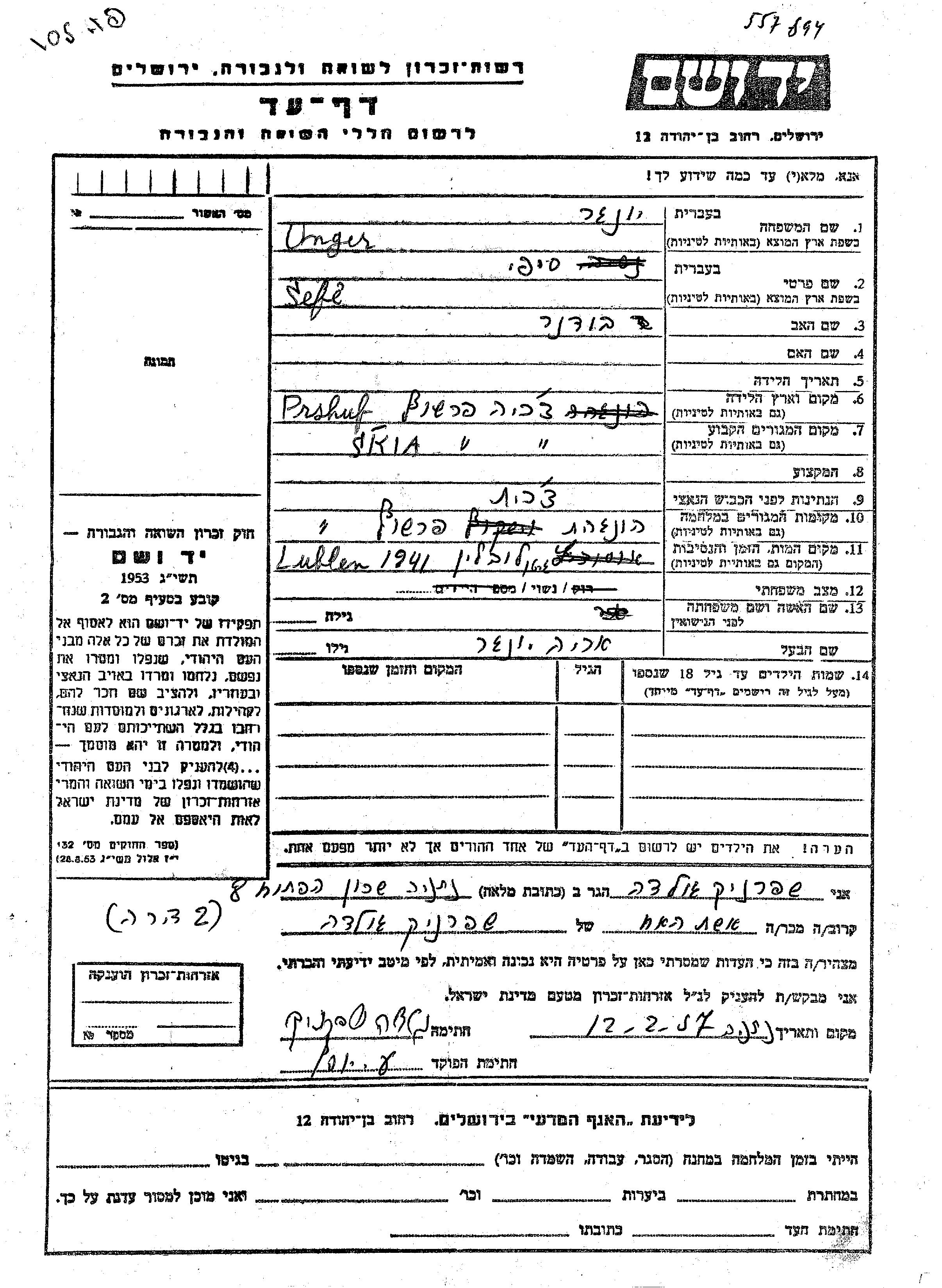 Sefe Unger Iunger, geb. Bodner wurde in Presov, Tschechoslowakei geboren. Sie war mit Arie Verheiratet. Vor dem Zweiten Weltkrieg lebte sie in Presov, Tschechoslowakei. Während des Krieges war sie in Presov, Tschechoslowakei.