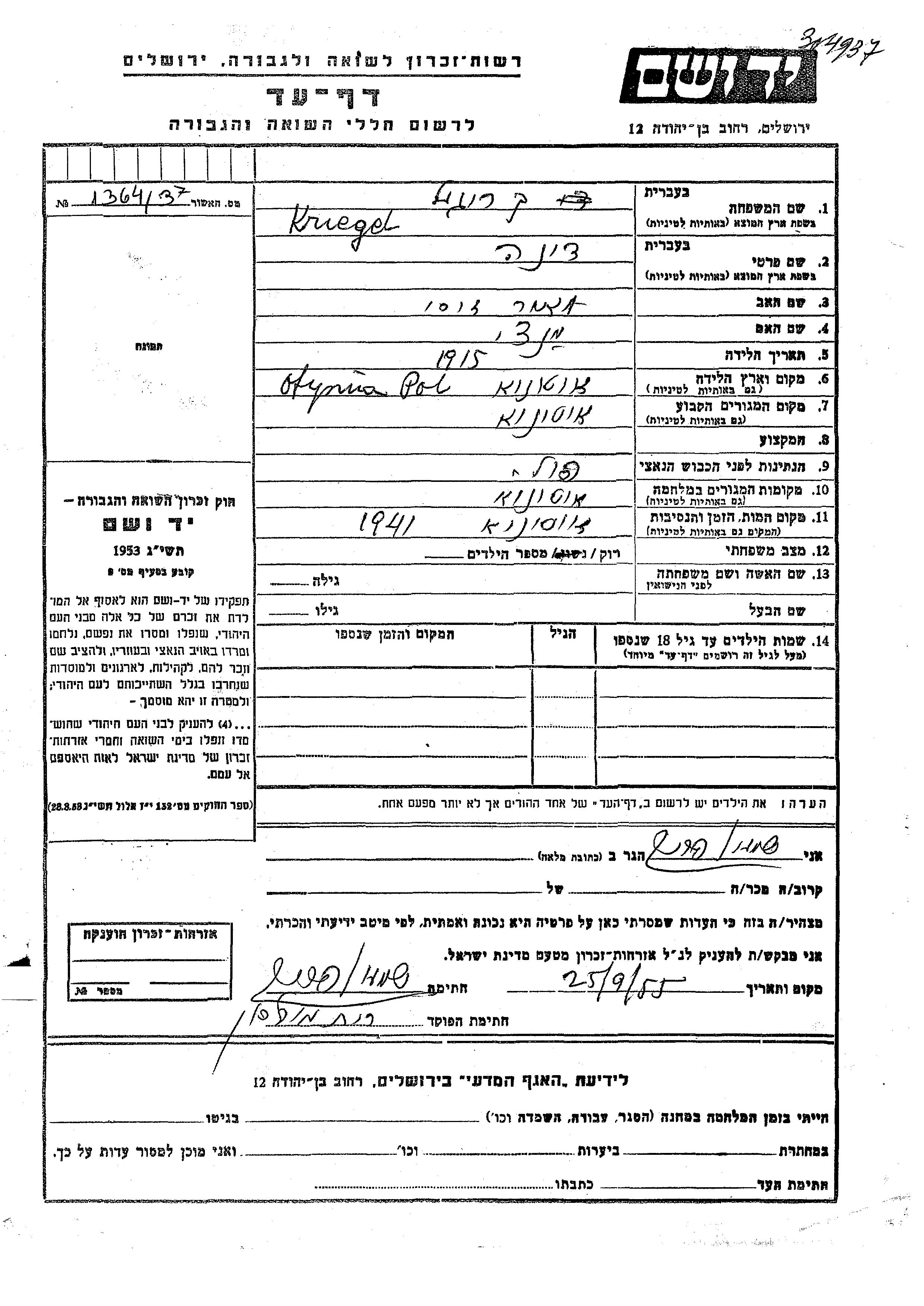 Dina Kriegel wurde im Jahr 1915 in Ottynia, Polen geboren. Sie war die Tochter von Meir Zusi und Mantzi. Sie war Ledig. Vor dem Zweiten Weltkrieg lebte sie in Ottynia, Polen. Während des Krieges war sie in Ottynia, Polen.