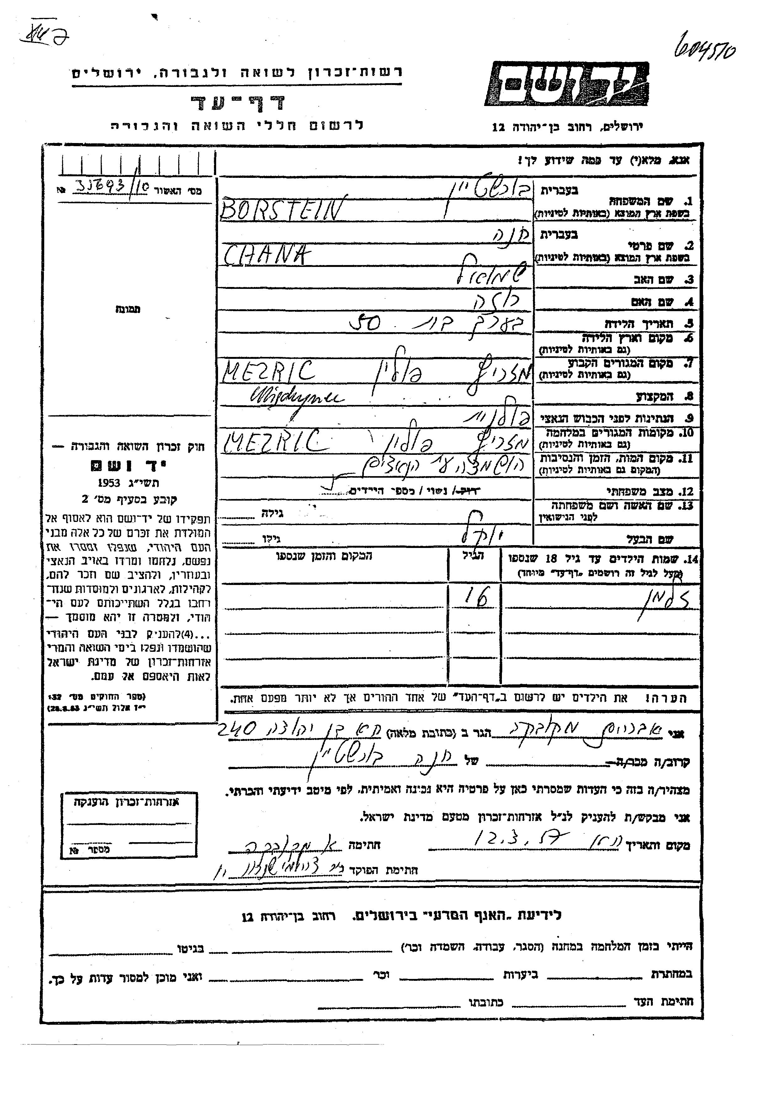 Chana Borstein wurde Sie war die Tochter von Shmuel und Roza. Sie war mit Yaakov Verheiratet. Vor dem Zweiten Weltkrieg lebte sie in Mezrich, Polen. Während des Krieges war sie in Mezrich, Polen.