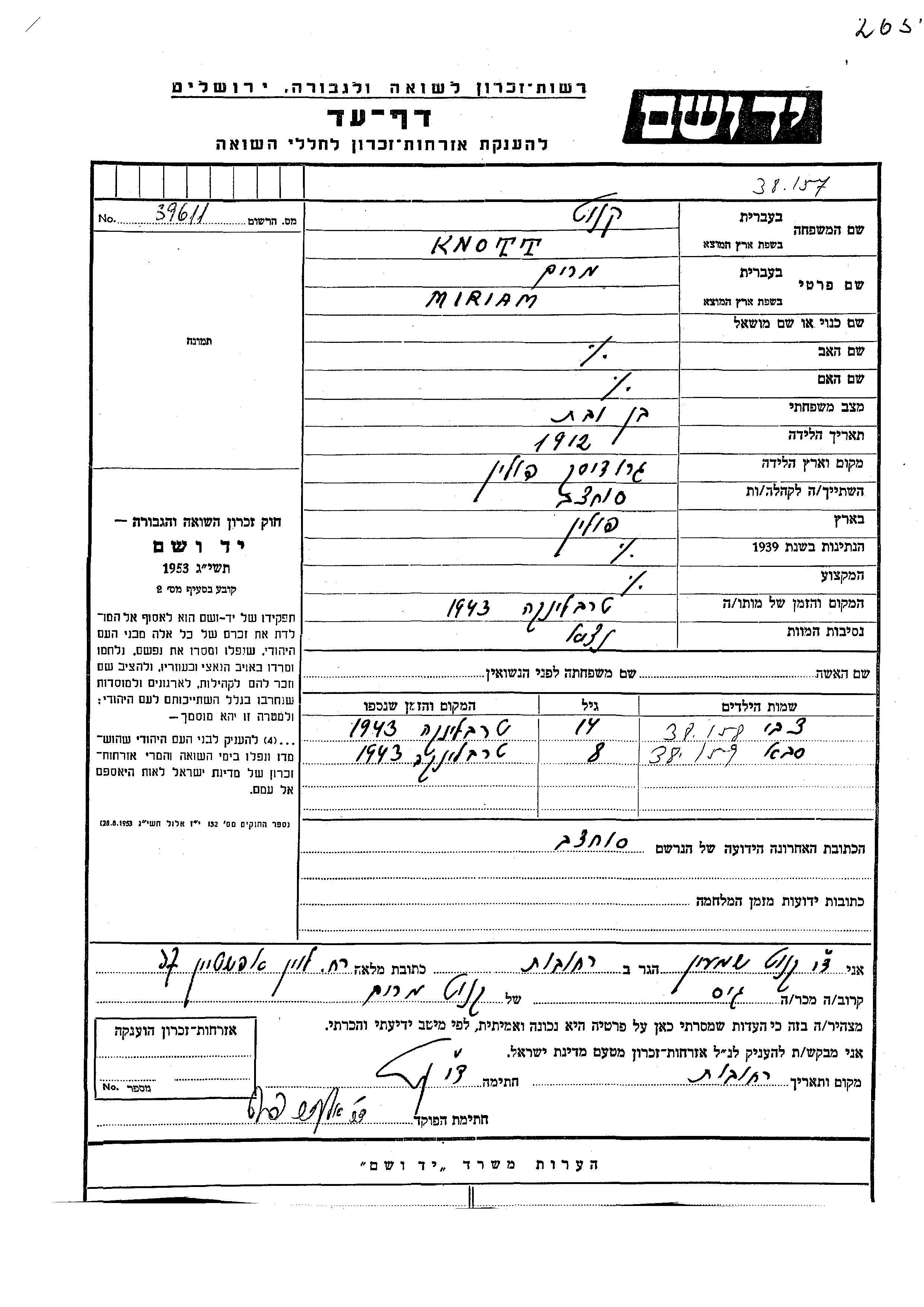 Miriam Knott wurde im Jahr 1912 in Grodzisk Mazowiecki, Polen geboren. Sie war Verheiratet. Während des Krieges war sie in Sochaczew, Polen.