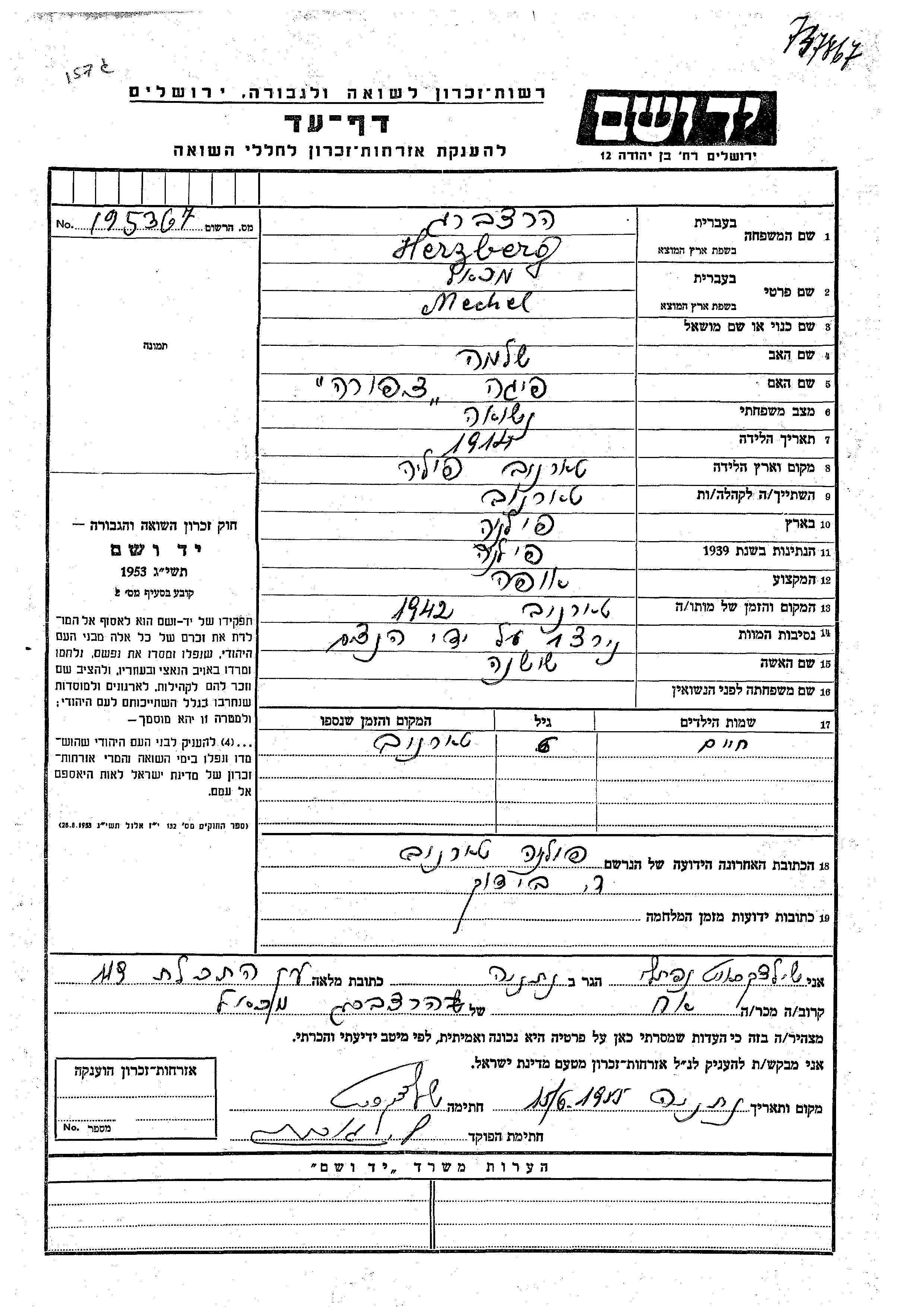Mechel Herzberg wurde im Jahr 1914 in Tarnow, Polen geboren. Er war der Sohn von Shlomo und Feiga Tzipora. Er war Bäcker/-in und mit Shoshana Verheiratet. Vor dem Zweiten Weltkrieg lebte er in Tarnow, Polen. Während des Krieges war er in Tarnow, Polen.