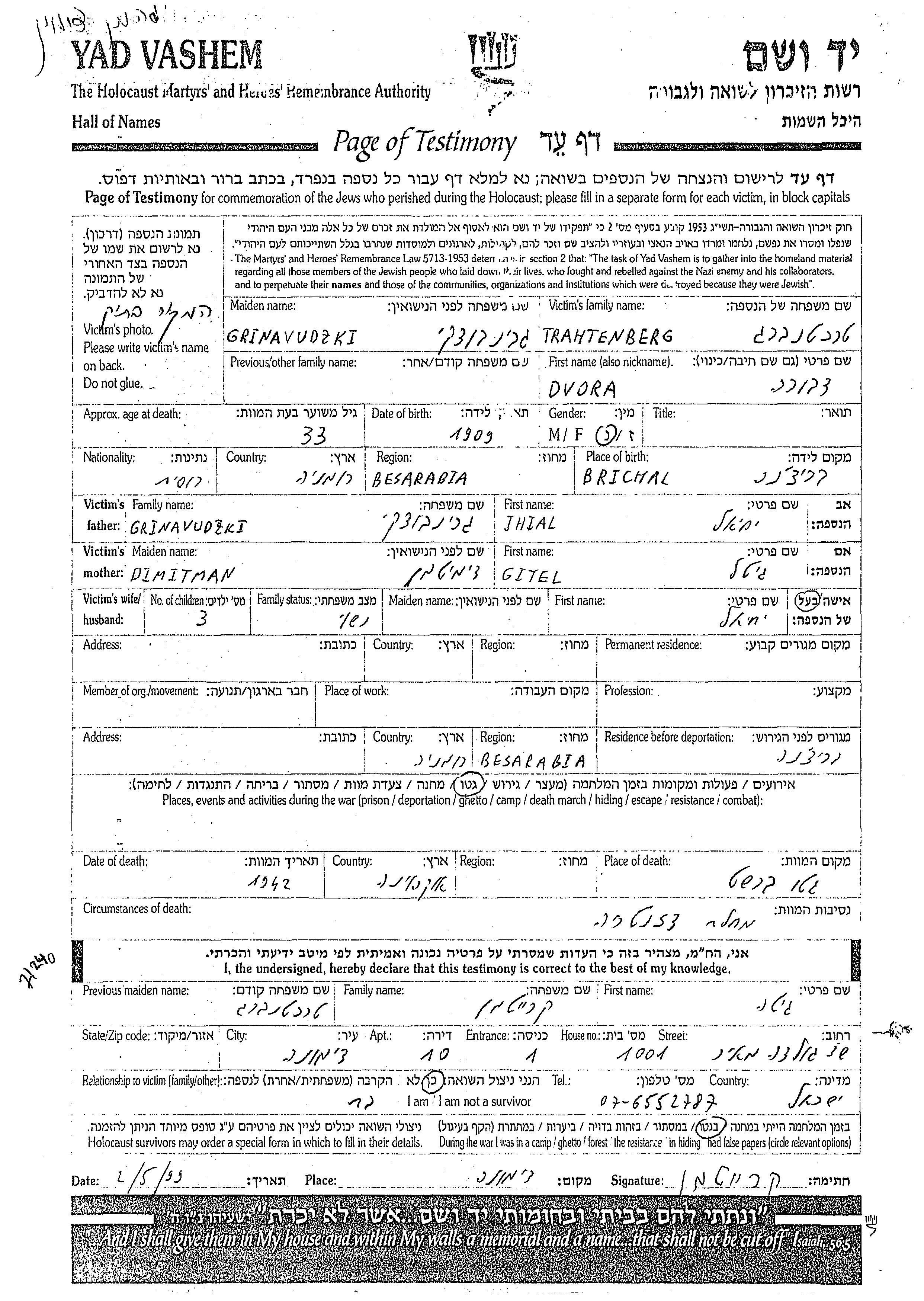 Dvora Trahtenberg, geb. Grinavudzki wurde im Jahr 1909 in Brichany, Rumänien geboren. Sie war die Tochter von Ihial und Gitel, geb. Dimetman. Sie war mit Yekhiel Verheiratet. Vor dem Zweiten Weltkrieg lebte sie in Brichany, Rumänien. Während des Krieges war sie in Brichany, Rumänien.