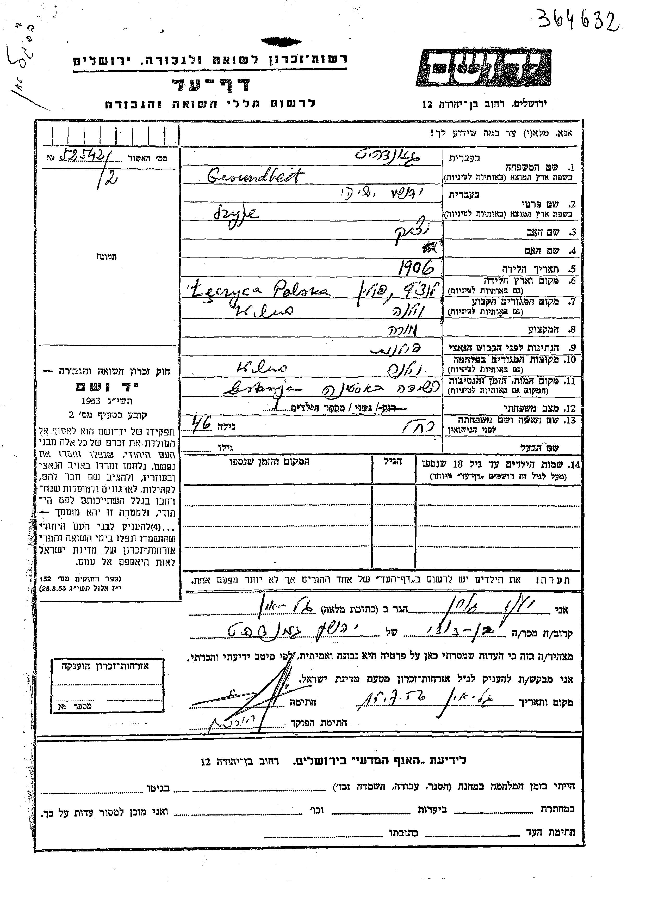 Szyje Ieshaiahu Gesundheit wurde im Jahr 1906 in Leczyca, Polen geboren. Er war der Sohn von Yitzkhak. Er war Lehrer/in und mit Rakhel Verheiratet. Vor dem Zweiten Weltkrieg lebte er in Wilno, Polen. Während des Krieges war er in Wilno, Polen.