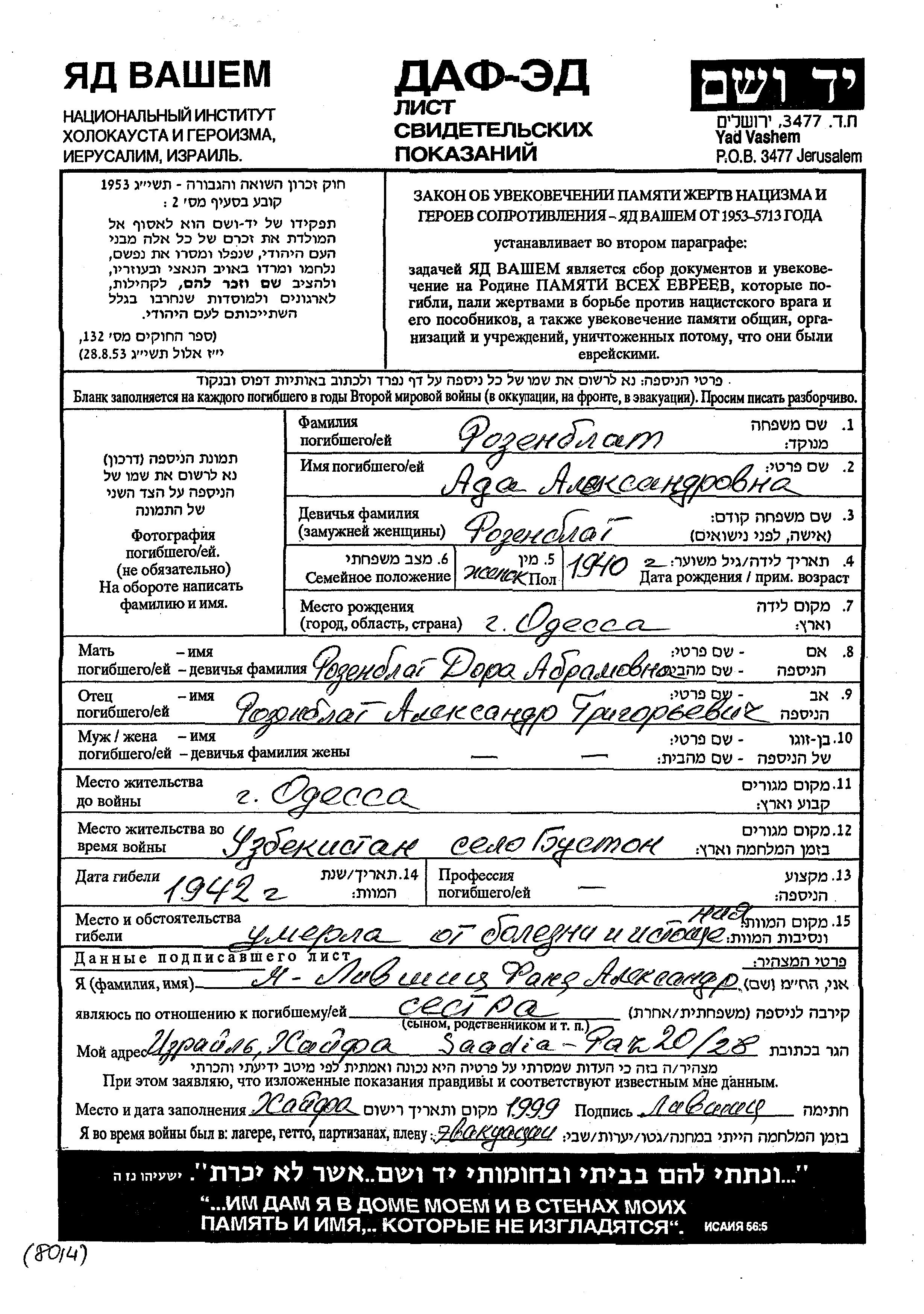 Ada Rozenblat, geb. Rozenblat wurde im Jahr 1940 in Odessa, Ukraine (UdSSR) geboren. Sie war die Tochter von Aleksander und Dora. Vor dem Zweiten Weltkrieg lebte sie in Odessa, Ukraine (UdSSR). Während des Krieges war sie in Uzbekistan (UdSSR). Ada wurde nach der Evakuierung/ ins Innere der Sowjetunion registriert.