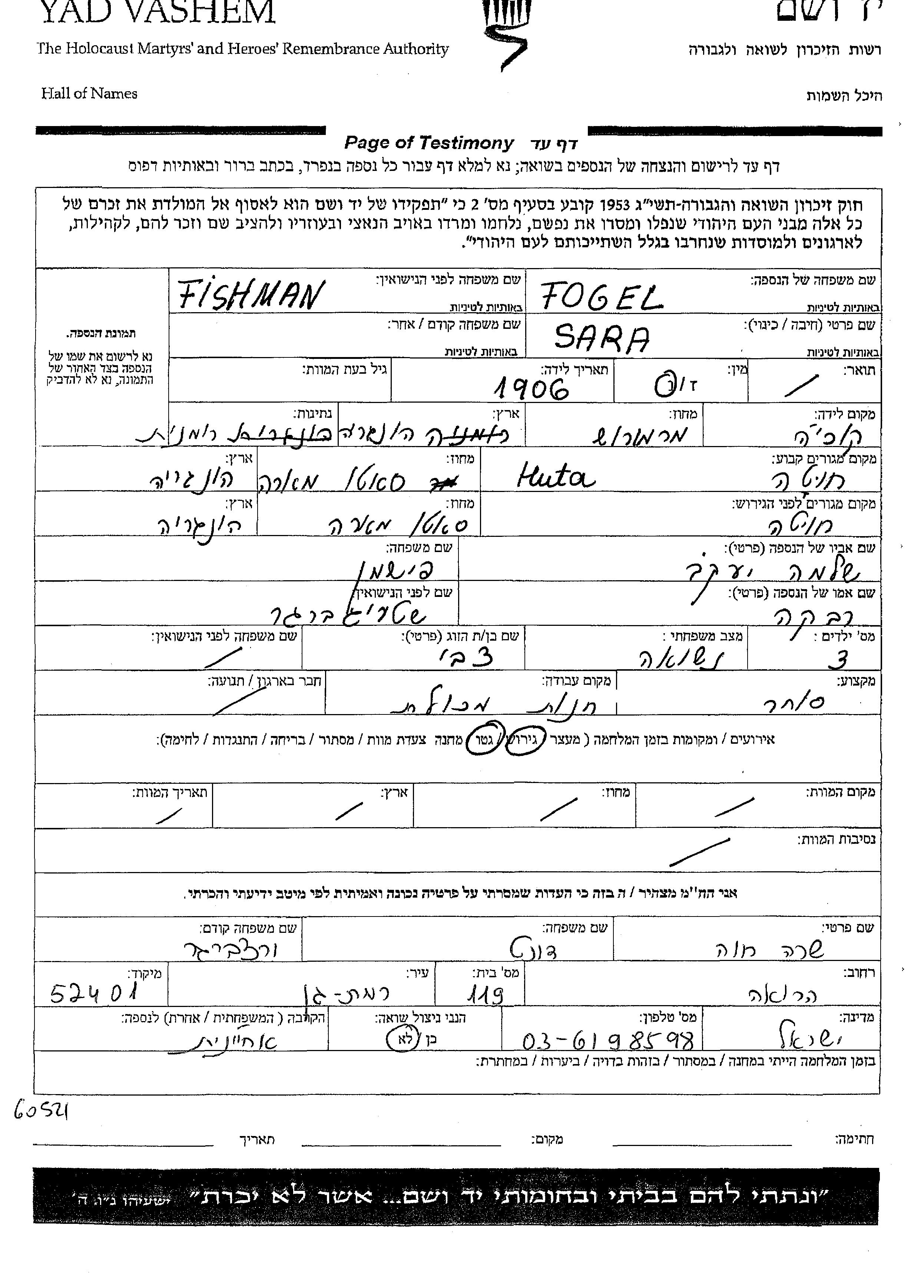 Sara Fogel, geb. Fishman wurde im Jahr 1906 geboren. Sie war die Tochter von Shlomo Yaakov und Rivka. Sie war Kaufmann/-frau und mit Tzvi Verheiratet. Vor dem Zweiten Weltkrieg lebte sie in Huta, Rumänien. Während des Krieges war sie in Huta, Rumänien.