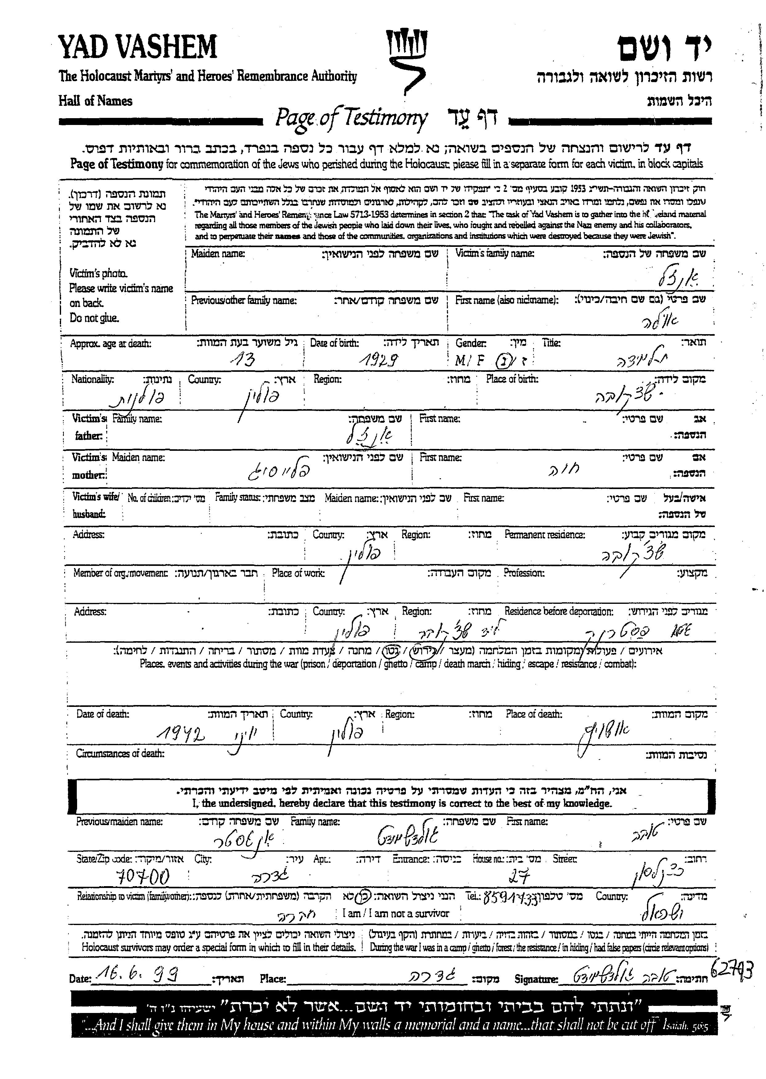 Ula Anzel wurde im Jahr 1929 in Szczakowa, Polen geboren. Sie war die Tochter von Khaia. Sie war Schüler/-in und Kind. Vor dem Zweiten Weltkrieg lebte sie in Szczakowa, Polen. Während des Krieges war sie in Undeciphered Place, Polen.