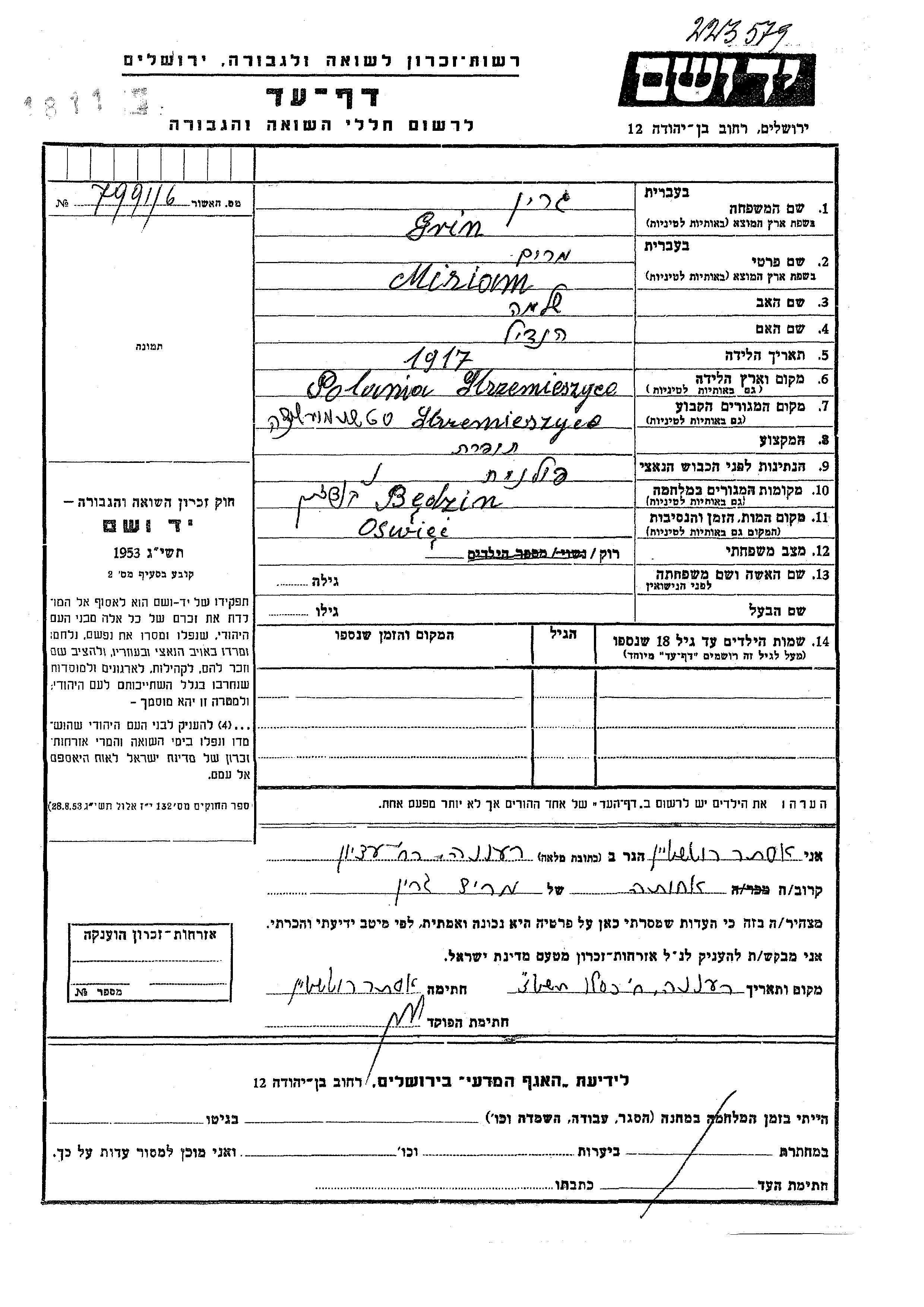 Miriam Grin wurde im Jahr 1917 geboren. Sie war die Tochter von Shlomo und Hendil. Sie war Schneiderin und Ledig. Während des Krieges war sie in Będzin, Polen.
