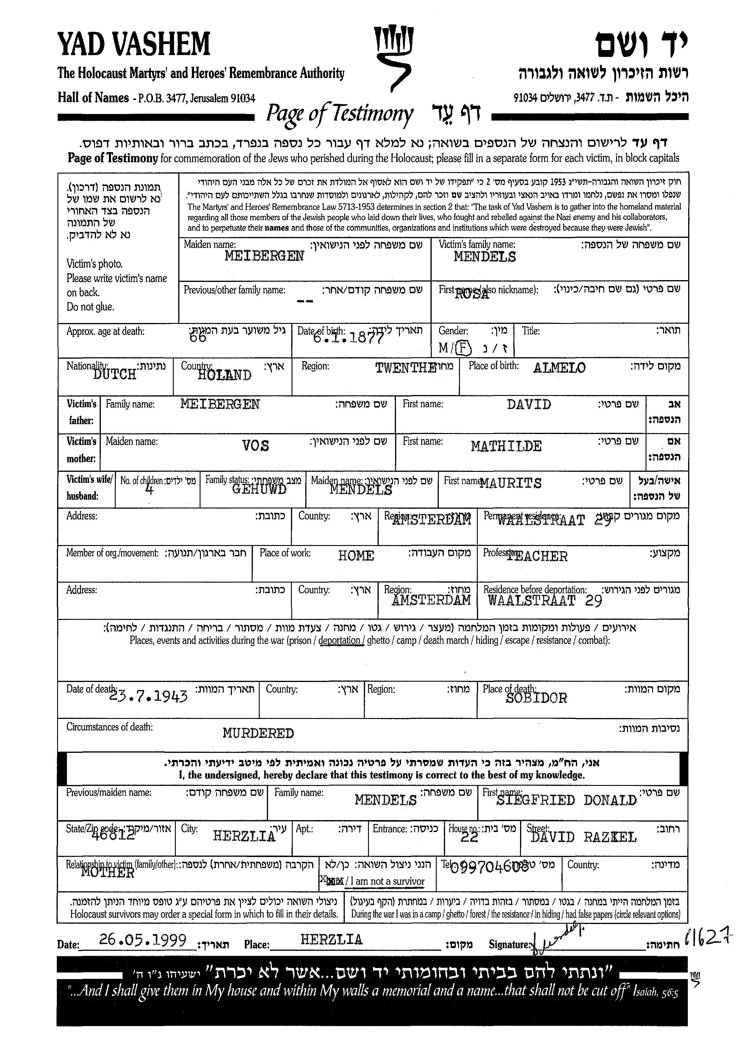 Rosa Mendels, geb. Meibergen wurde im Jahr 1877 in Almelo, Niederlande geboren. Sie war die Tochter von David und Mathilde. Sie war Lehrer/in und mit Maurits Verheiratet. Vor dem Zweiten Weltkrieg lebte sie in Amsterdam, Niederlande. Während des Krieges war sie in Amsterdam, Niederlande.