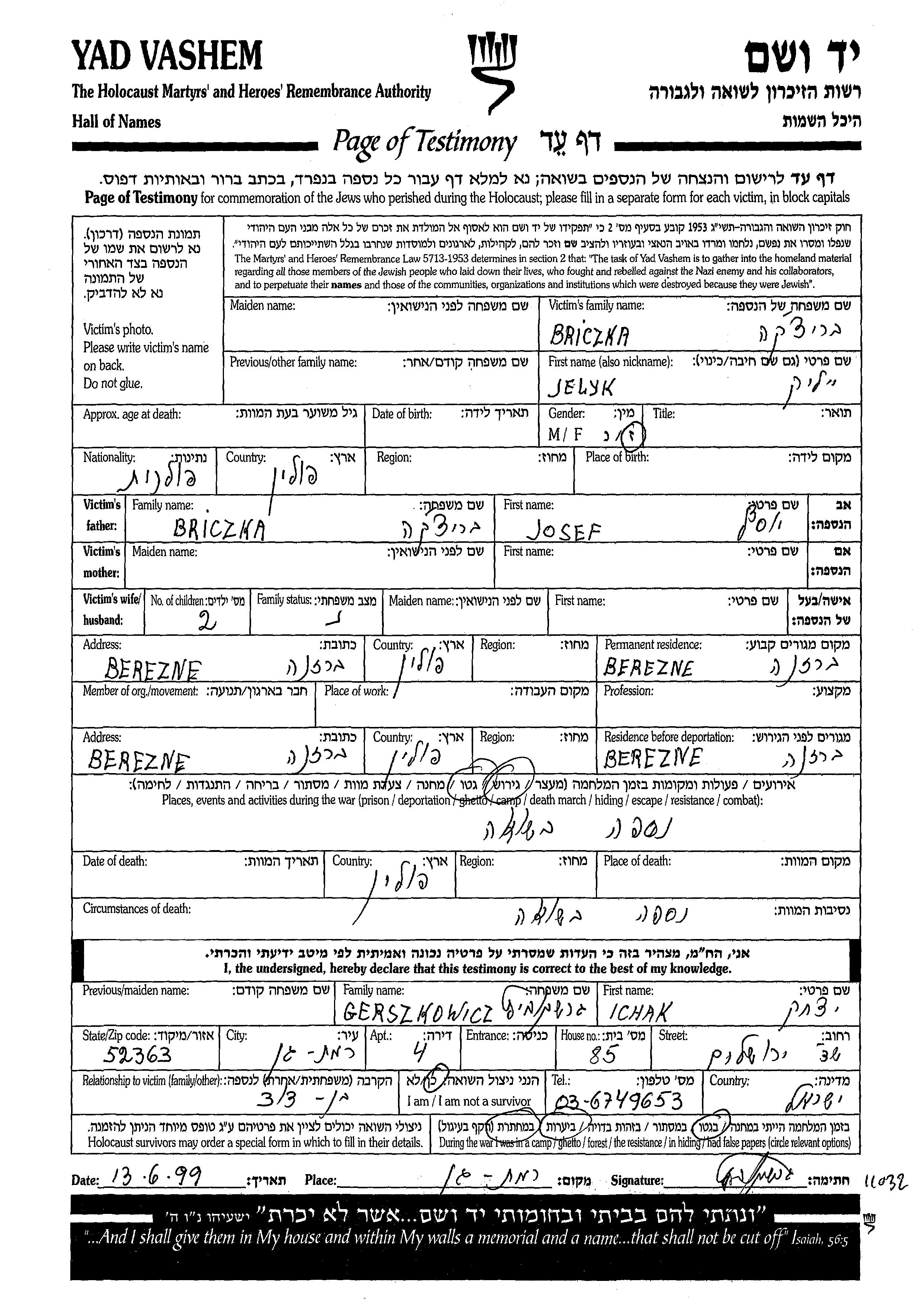 Jelyk Ielik Briczka wurde in Polen geboren. Er war der Sohn von Josef. Er war Verheiratet. Vor dem Zweiten Weltkrieg lebte er in Berezne, Polen. Während des Krieges war er in Berezne, Polen.