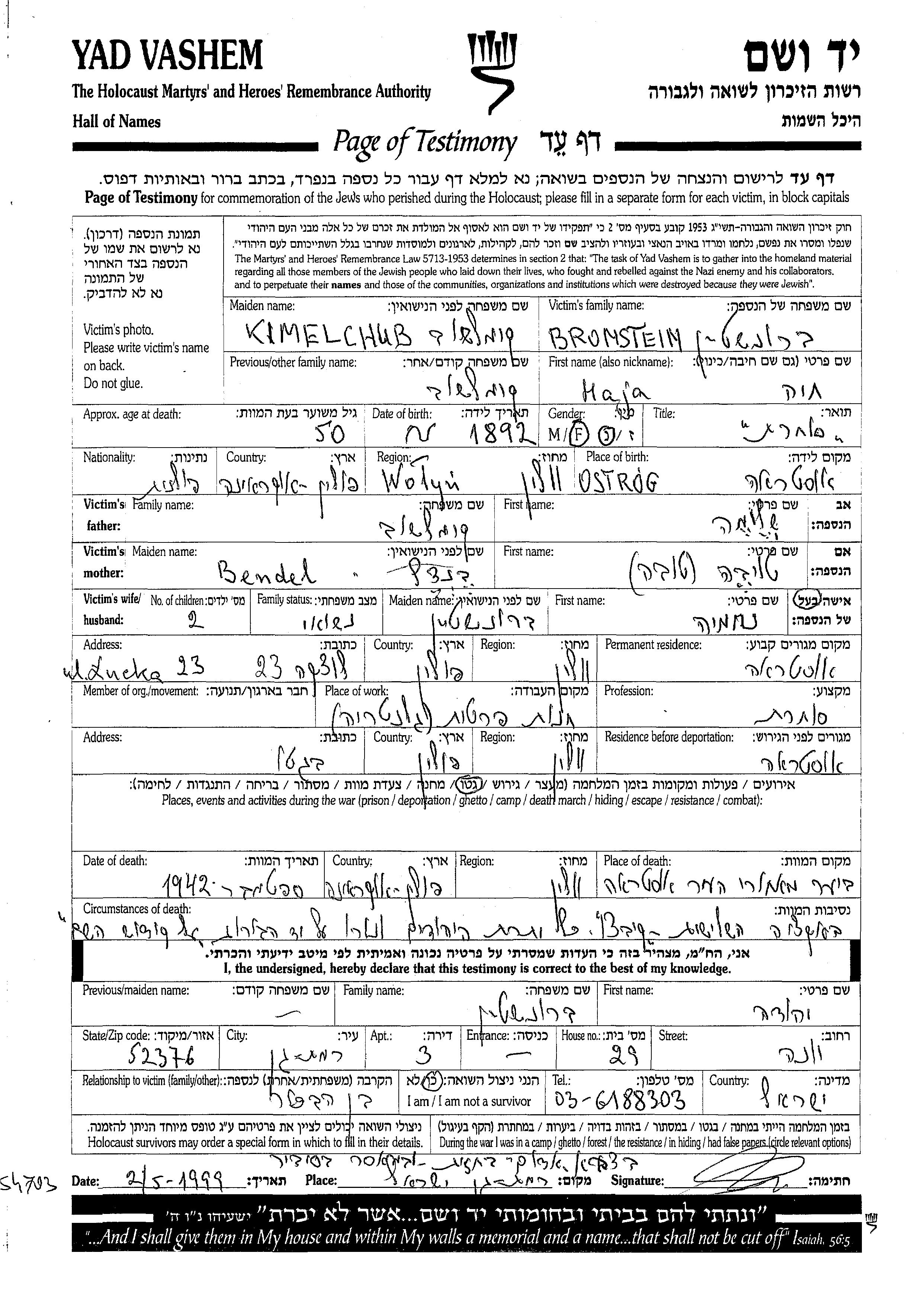 Haja Bronstein, geb. Kimelchub wurde im Jahr 1892 in Ostrog, Polen geboren. Sie war die Tochter von Loma und Toibe. Sie war Kaufmann/-frau und mit Nekhemia Verheiratet. Vor dem Zweiten Weltkrieg lebte sie in Ostrog, Polen. Während des Krieges war sie in Ostrog, Polen.