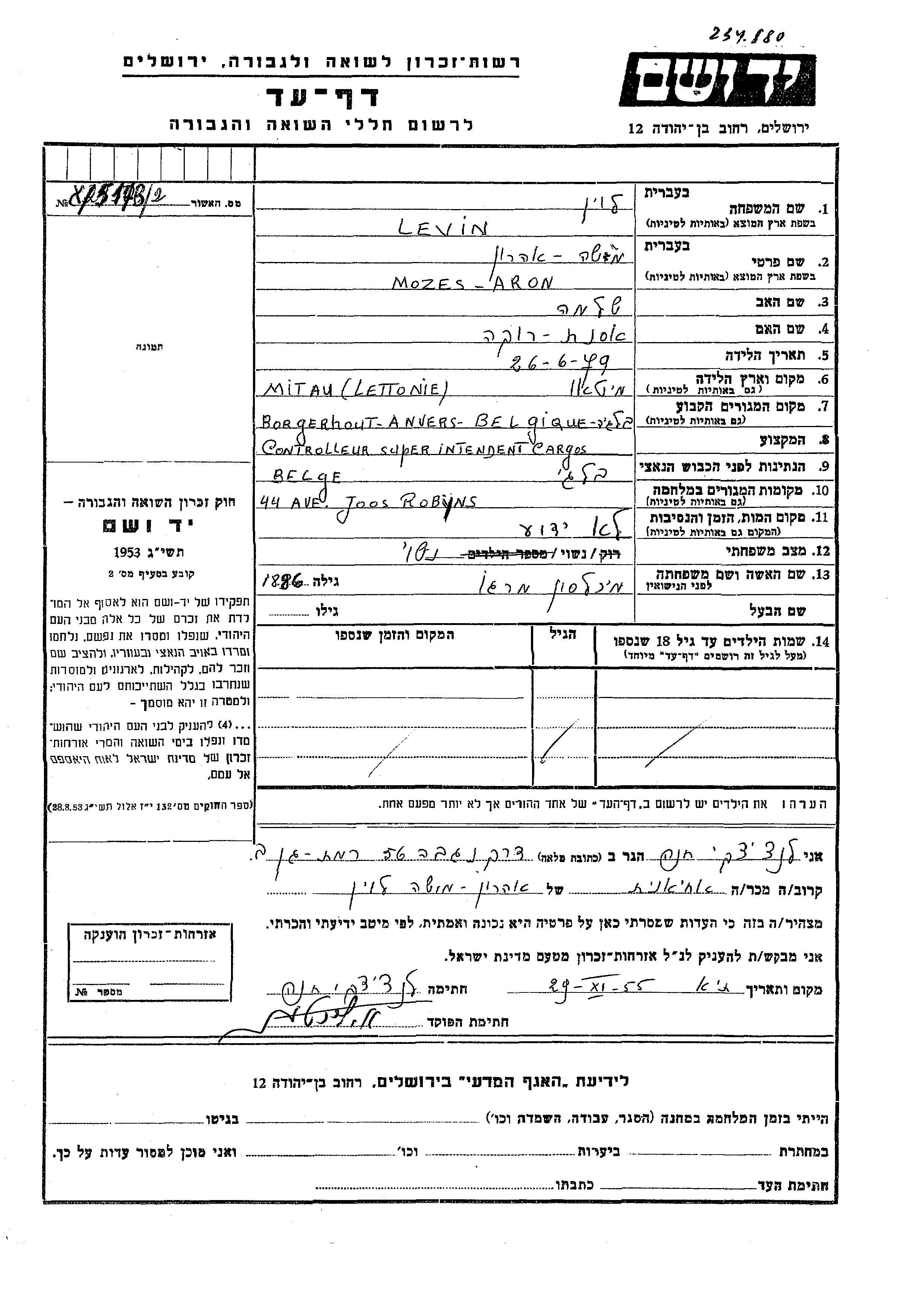 Moshe Aron Levin wurde im Jahr 1879 in Mitau, Lettland geboren. Er war der Sohn von Shlomo und Asnat Roka. Er war mit Margareta, geb. Mikhelson Verheiratet. Vor dem Zweiten Weltkrieg lebte er in Borgerhout, Belgien.