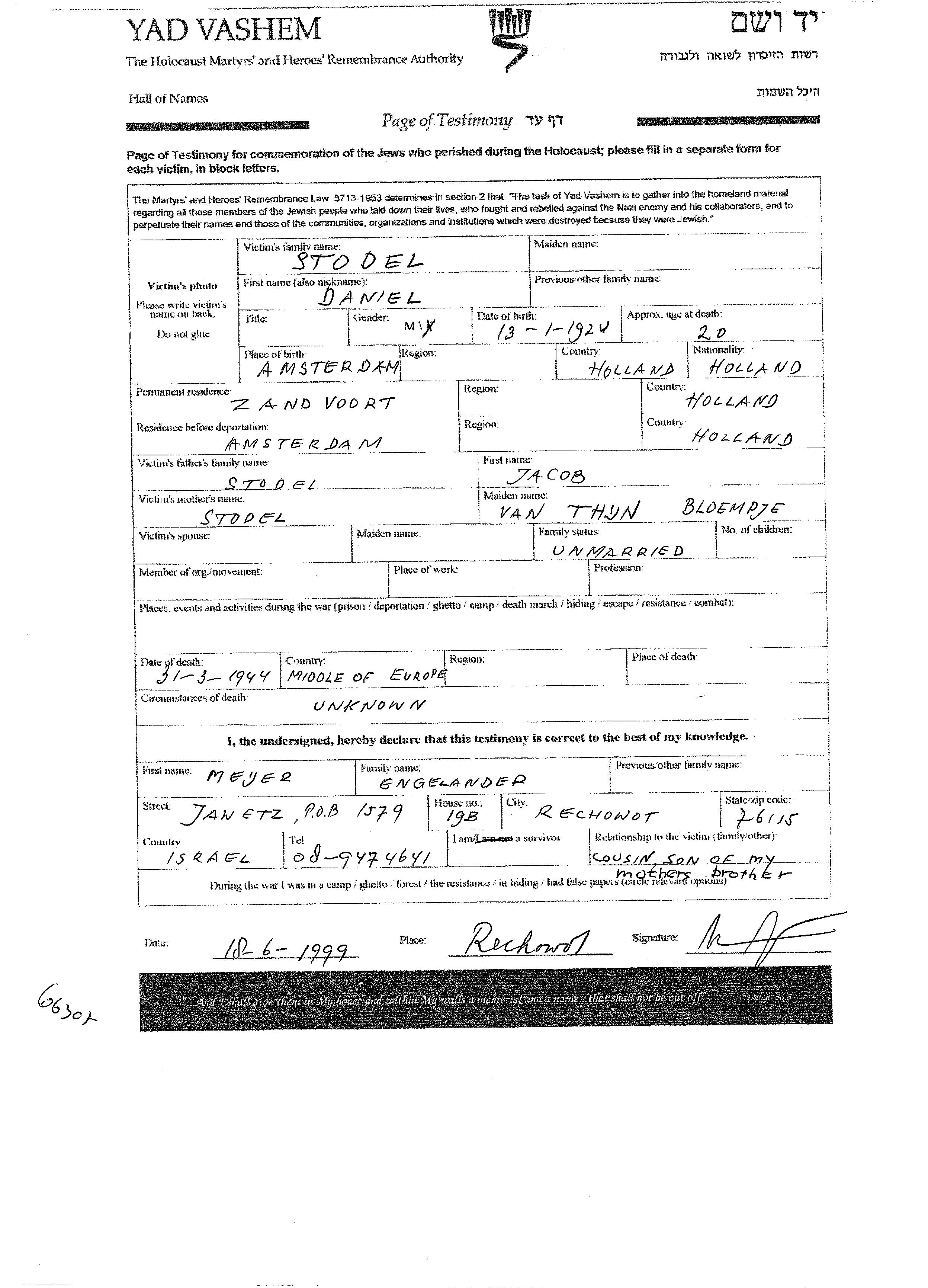 Daniel Stodel wurde im Jahr 1924 in Amsterdam, Niederlande geboren. Er war der Sohn von Jacob und Bloempje. Er war Ledig.
