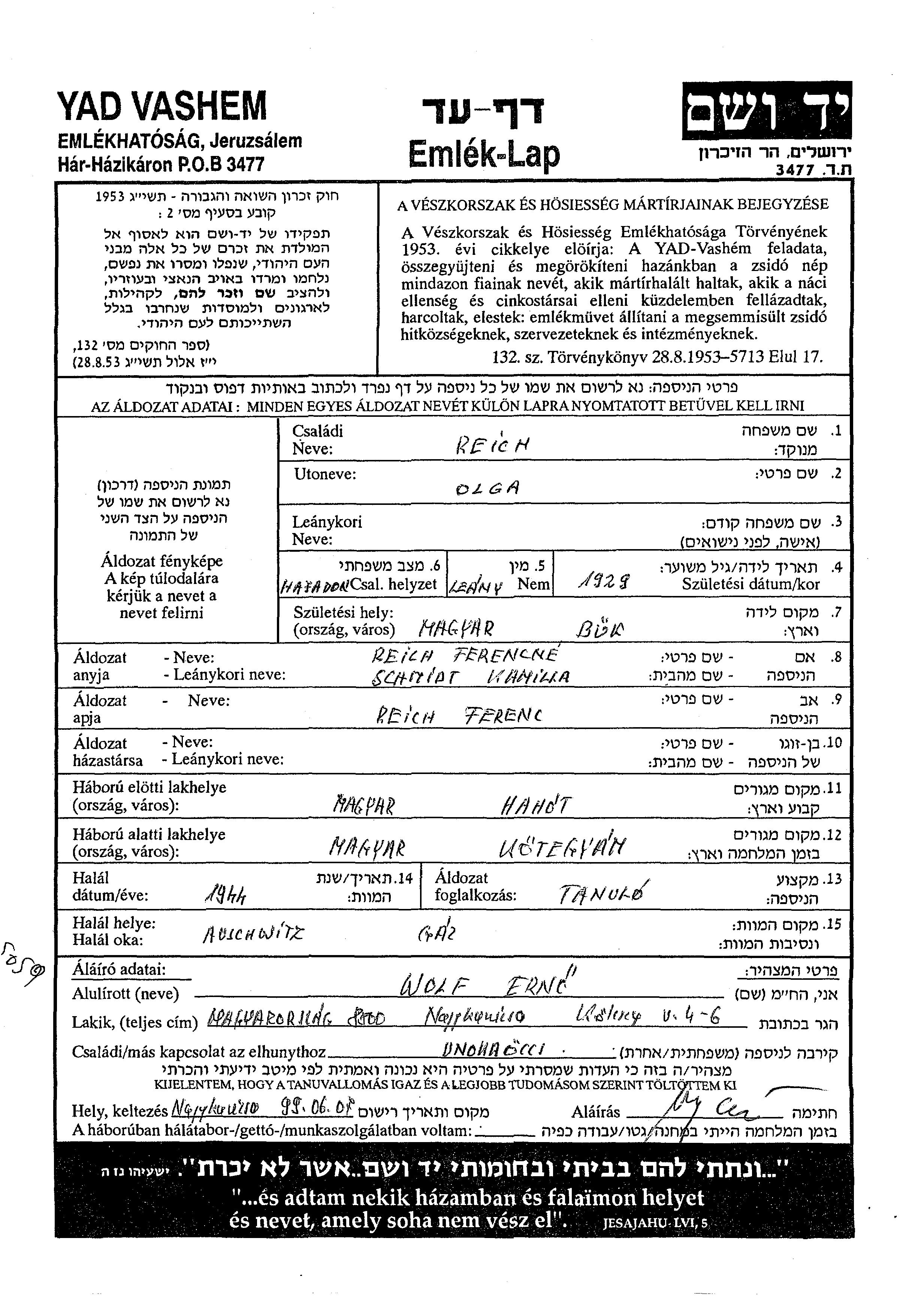 Olga Reich wurde im Jahr 1929 in Buk, Ungarn geboren. Sie war die Tochter von Ferentz und Kamilla. Sie war Schüler/-in und Ledig. Vor dem Zweiten Weltkrieg lebte sie in Hahot, Ungarn. Während des Krieges war sie in Kotegyan, Ungarn.