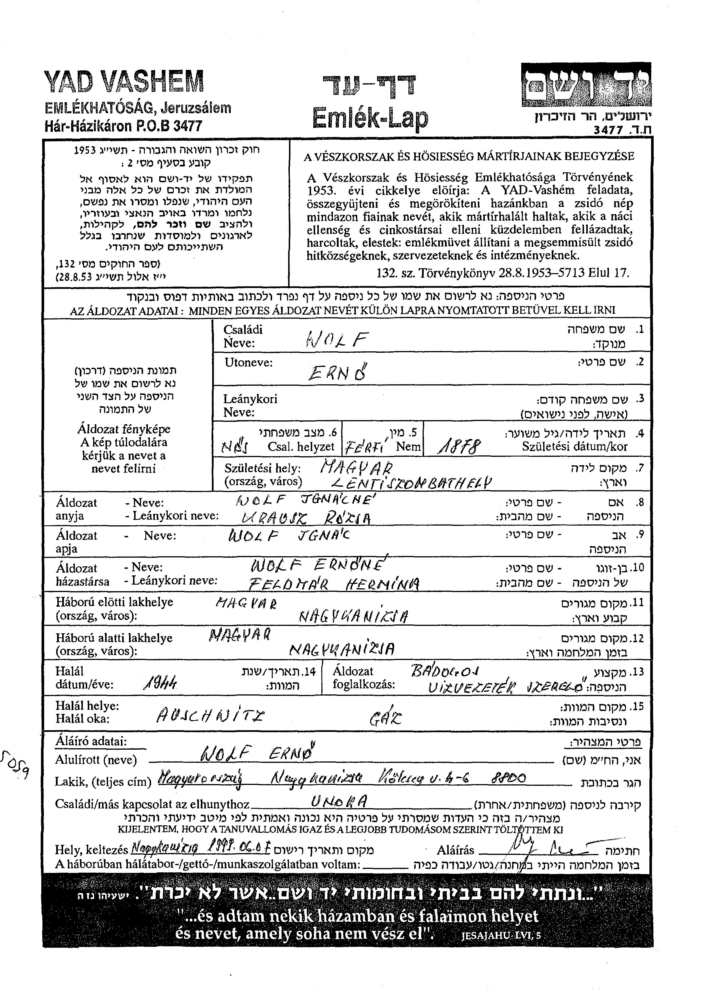 Erno Wolf wurde im Jahr 1878 in Lentiszombathely, Ungarn geboren. Er war der Sohn von Ignac und Rozia. Er war Blechschmied und mit Hermina, geb. Feldmar Verheiratet. Vor dem Zweiten Weltkrieg lebte er in Nagykanizsa, Ungarn. Während des Krieges war er in Nagykanizsa, Ungarn.
