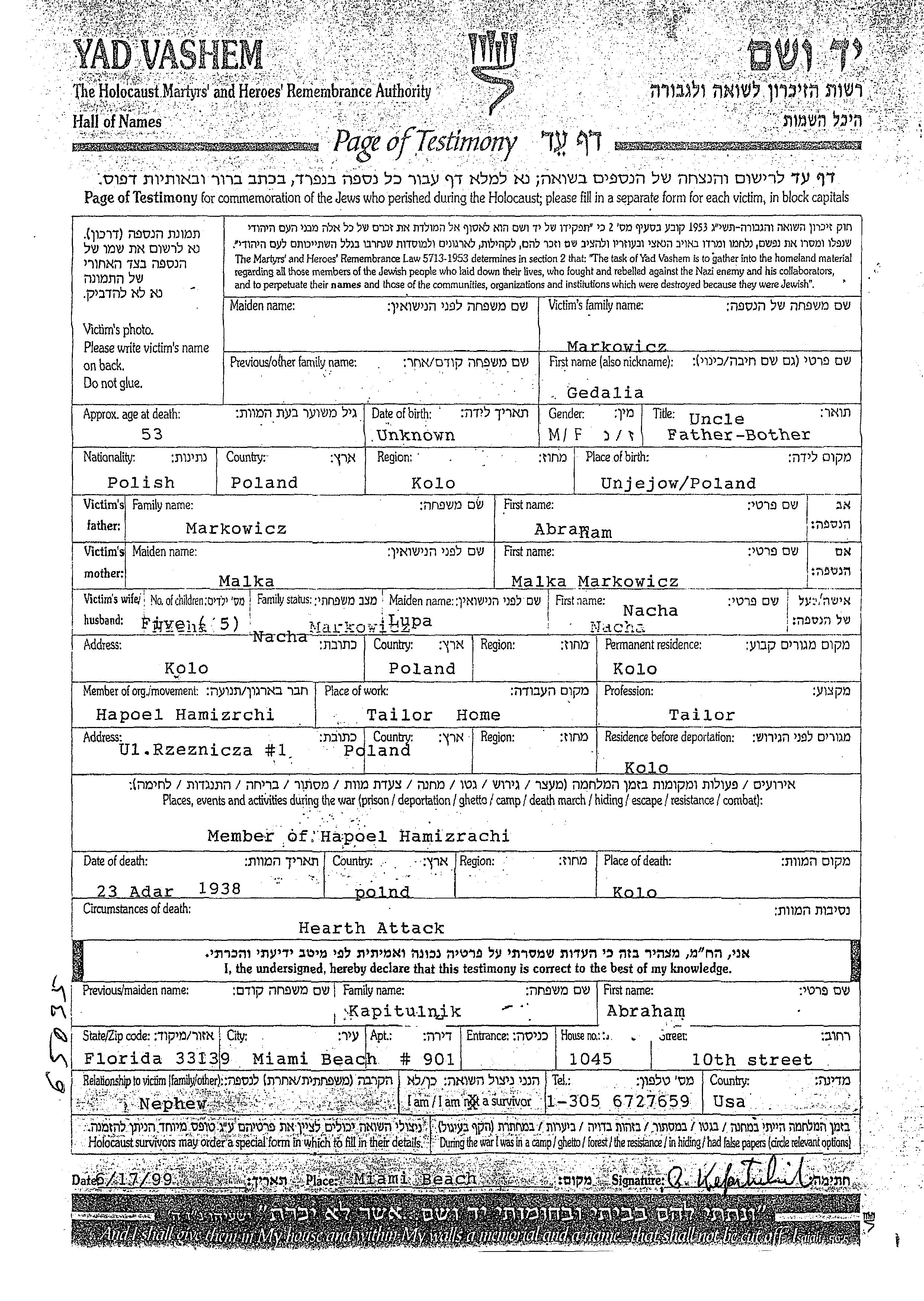 Gedalia Markowicz wurde in Uniejow, Polen geboren. Er war der Sohn von Abraham und Malka. Er war Schneider und mit Nacha, geb. Lupa Verheiratet. Vor dem Zweiten Weltkrieg lebte er in Kolo, Polen. Während des Krieges war er in Kolo, Polen.