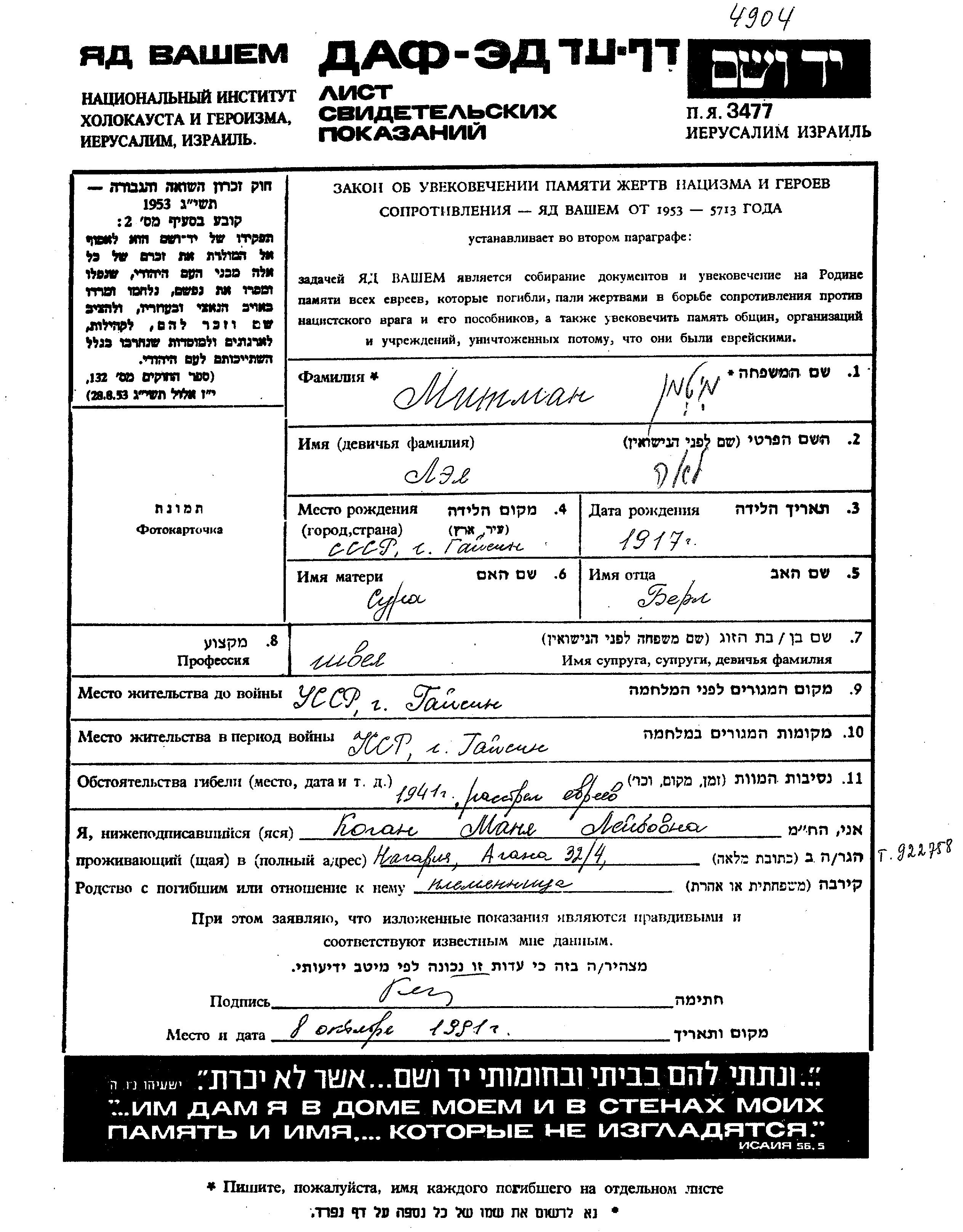 Lea Mitman wurde im Jahr 1917 in Gaisin, Ukraine (UdSSR) geboren. Sie war die Tochter von Berl und Sura. Sie war Schneiderin. Vor dem Zweiten Weltkrieg lebte sie in Gaisin, Ukraine (UdSSR). Während des Krieges war sie in Gaisin, Ukraine (UdSSR).