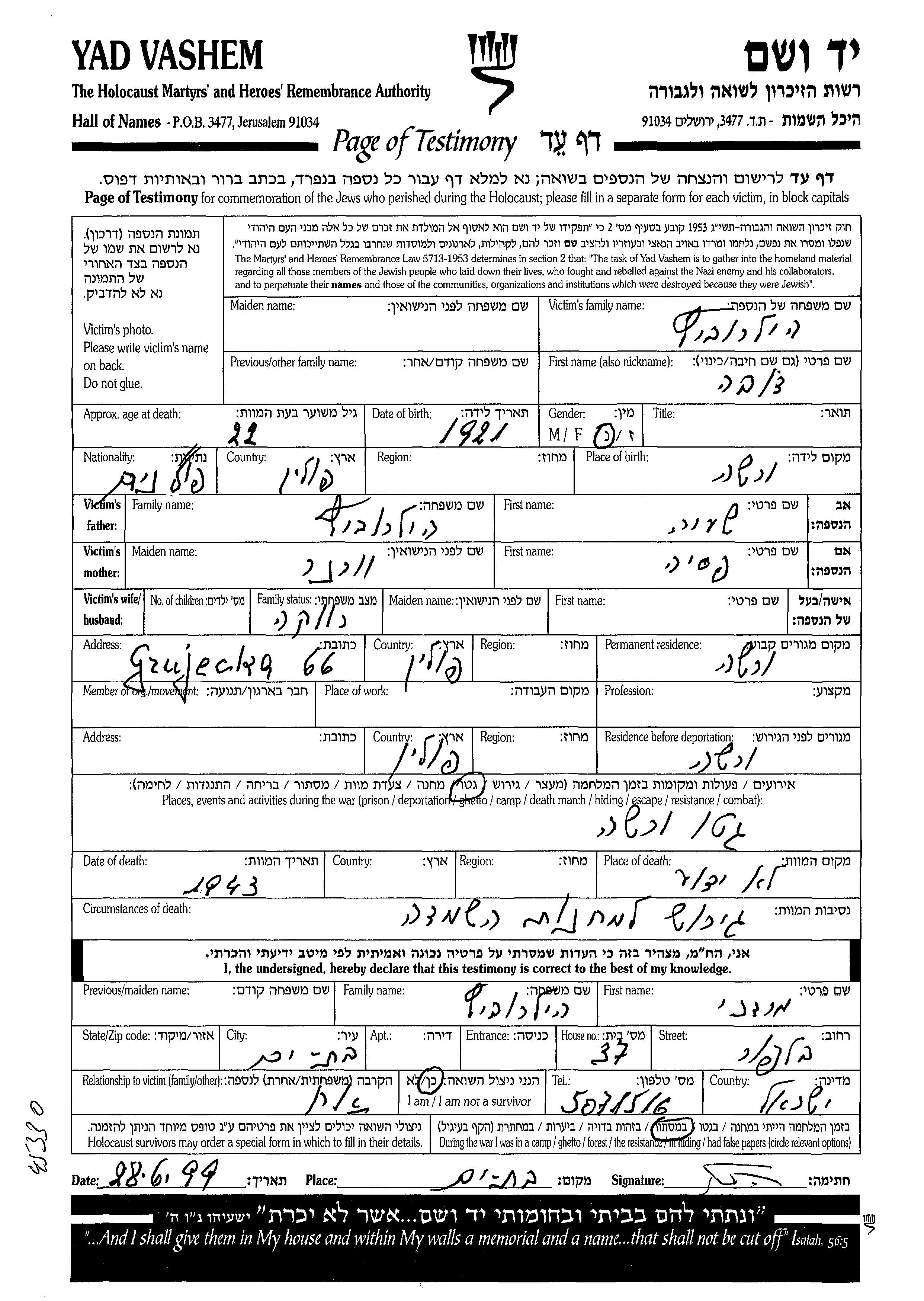Doba Hilerovitz wurde im Jahr 1921 in Varsha, Polen geboren. Sie war die Tochter von Shaia und Pesia. Sie war Ledig. Vor dem Zweiten Weltkrieg lebte sie in Varsha, Polen. Während des Krieges war sie in Varsha, Polen.