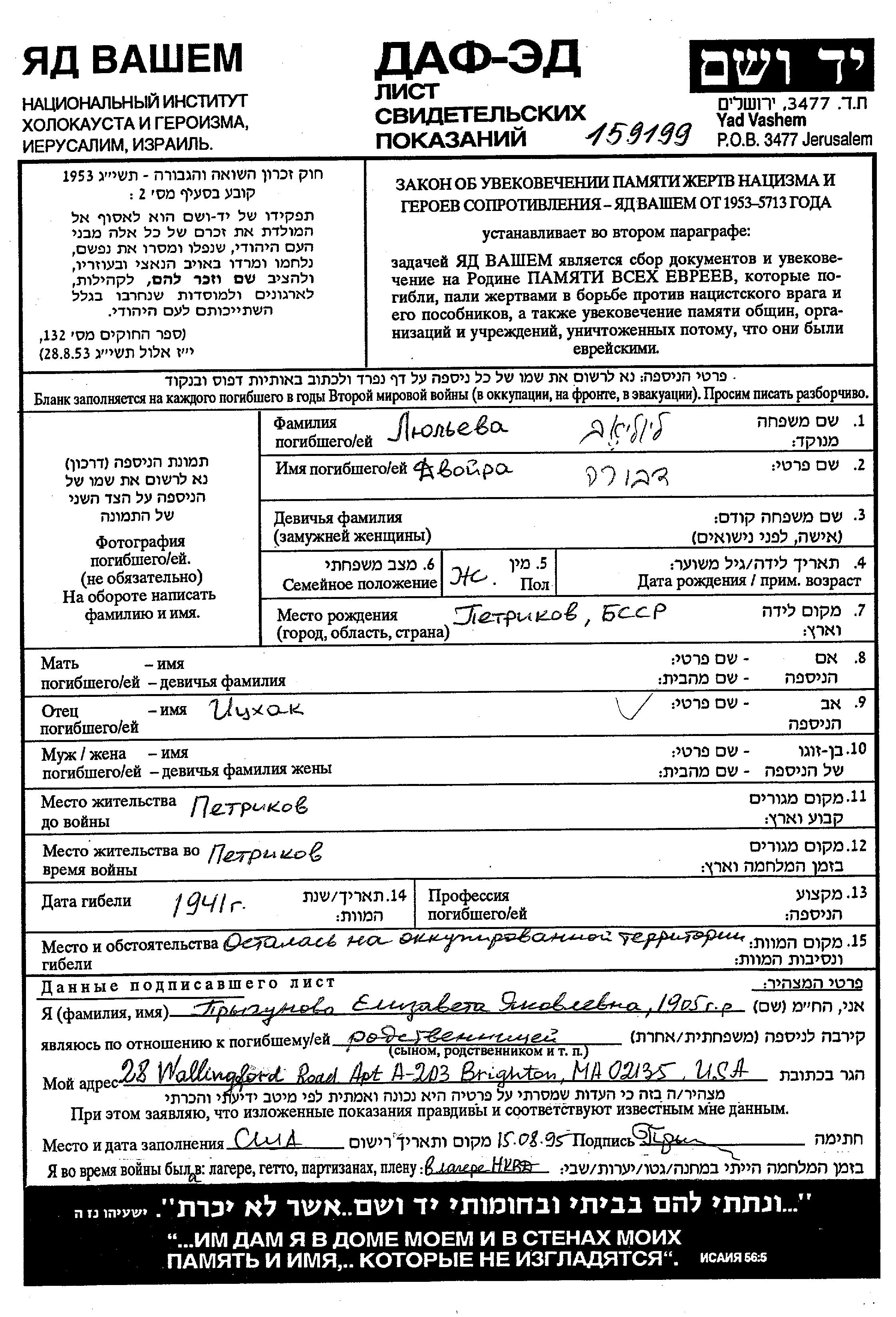 Dvoira Lulev wurde in Petrikov, Weißrussland (UdSSR) geboren. Sie war die Tochter von Yitzkhak. Vor dem Zweiten Weltkrieg lebte sie in Petrikov, Weißrussland (UdSSR). Während des Krieges war sie in Petrikov, Weißrussland (UdSSR).