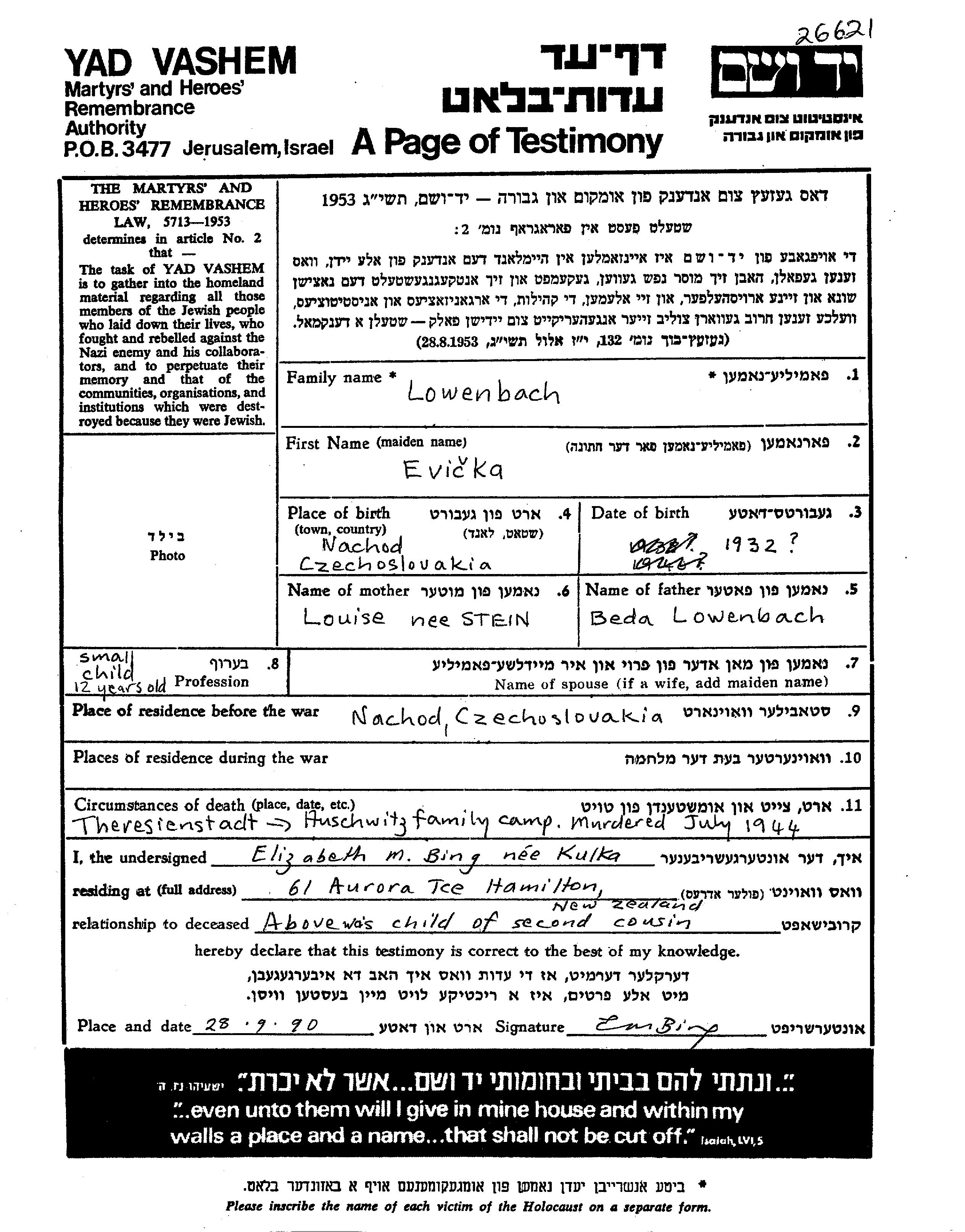 Evicka Löwenbach wurde im Jahr 1932 in Nachod, Tschechoslowakei geboren. Sie war die Tochter von Beda Beda und Louise Luiz, geb. Stein. Sie war Kind. Vor dem Zweiten Weltkrieg lebte sie in Nachod, Tschechoslowakei.