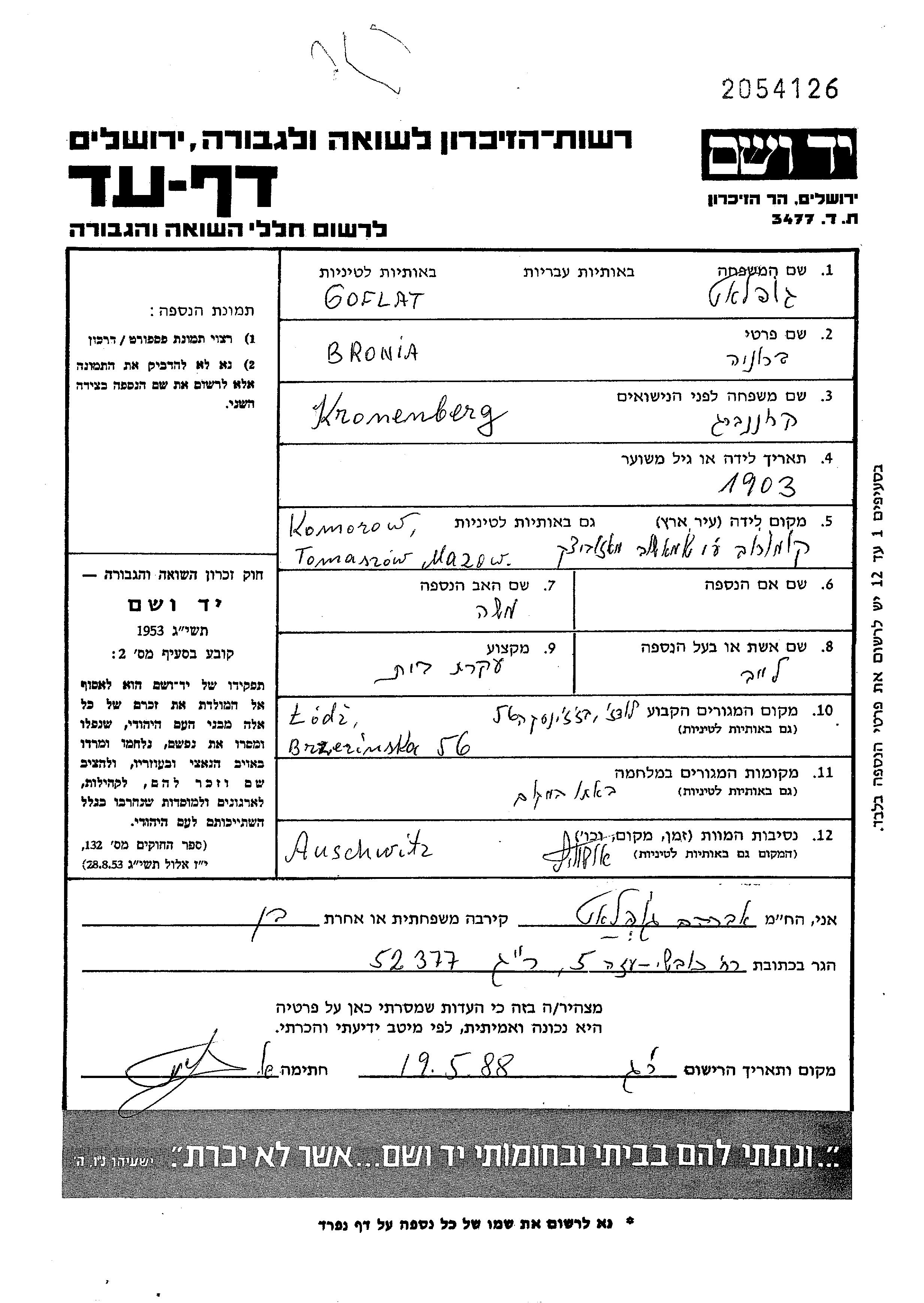 Bronia Goflat, geb. Kronenberg wurde in Komorow, Polen geboren. Sie war die Tochter von Moshe. Sie war Hausfrau und mit Leib Verheiratet. Vor dem Zweiten Weltkrieg lebte sie in Lodz, Polen. Während des Krieges war sie in Lodz, Polen.