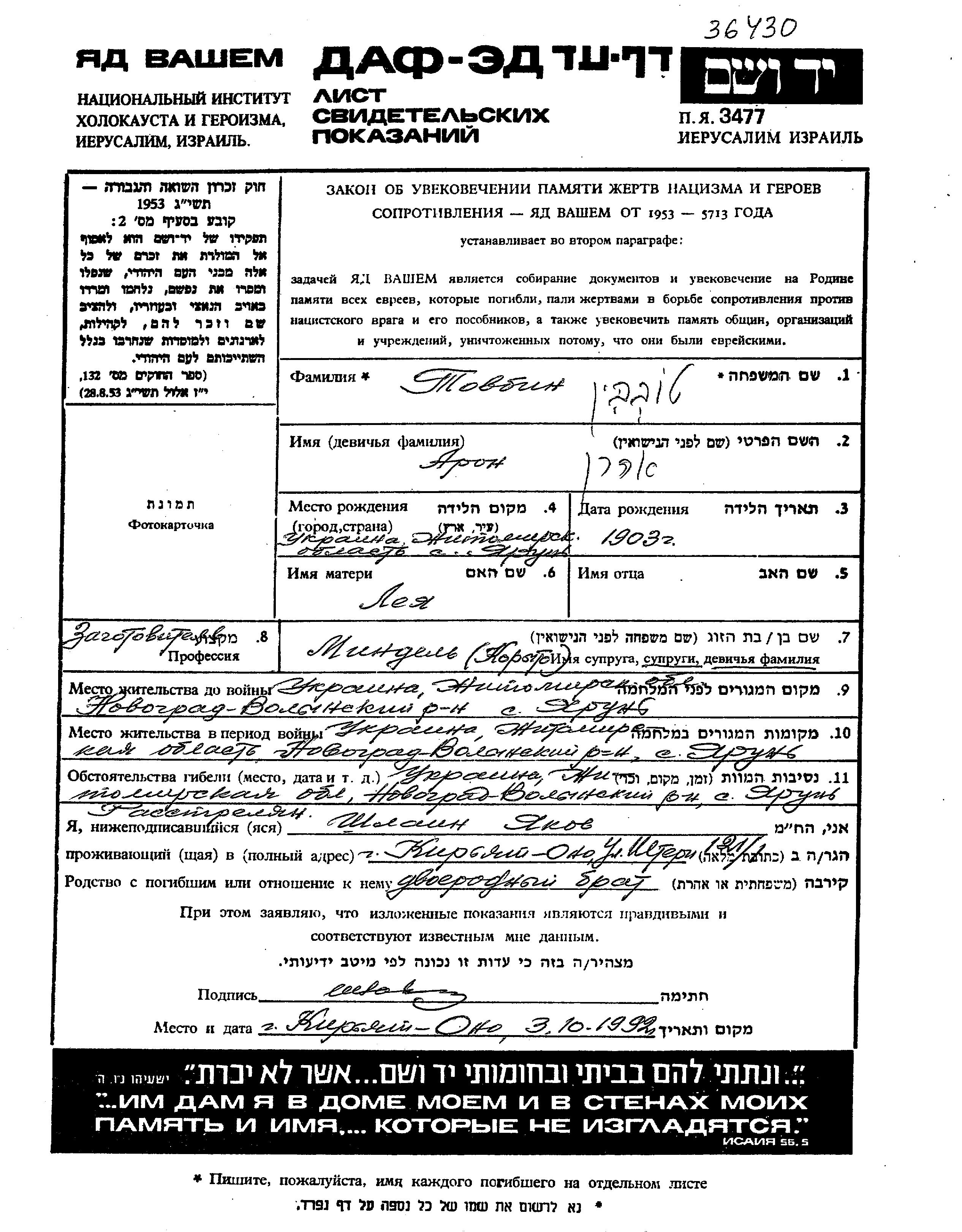 Tovbin Aron 1903 Yarun, Ukraine (UdSSR) Gedenkblatt